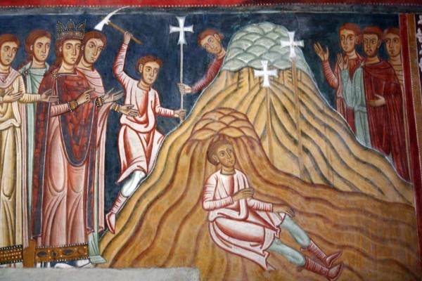 Когда откопали пещеру, то нашли в ней три креста и отдельно лежащую от них дощечку с надписью: “Иисус Назорей, Царь Иудейский”. Нужно было узнать, который из трех крестов есть Крест Спасителя. Иерусалимский патриарх (епископ) Макарий и царица Елена твердо верили и надеялись, что Бог укажет святой Крест Спасителя.