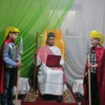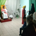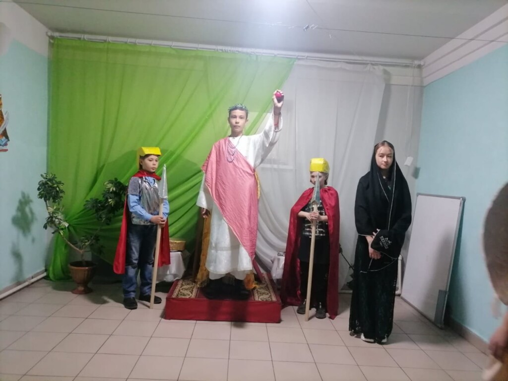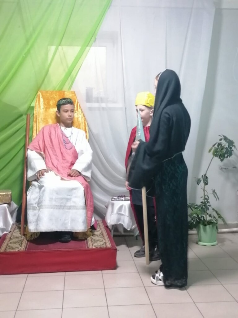 Дети подготовили театральную постановку о Воскресении Христовом и том, как равноапостольная Мария Магдалина пришла к императору Тиберию рассказать, что Христос Воскрес.
