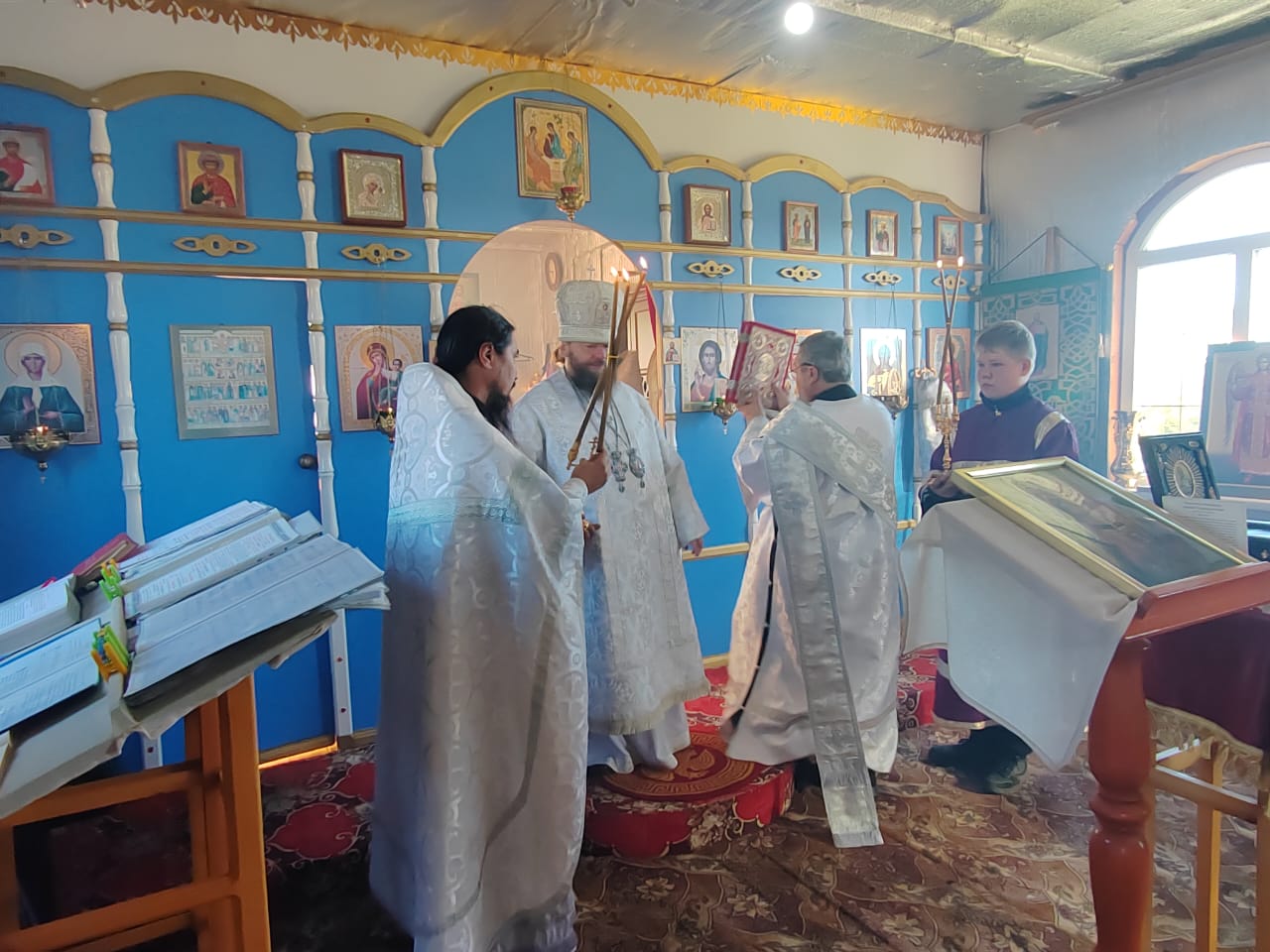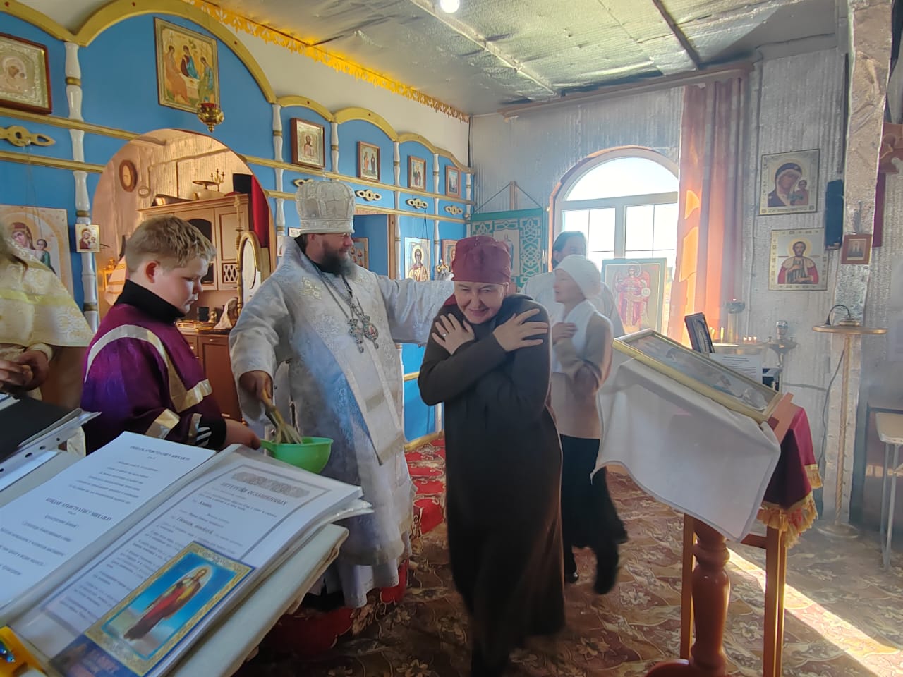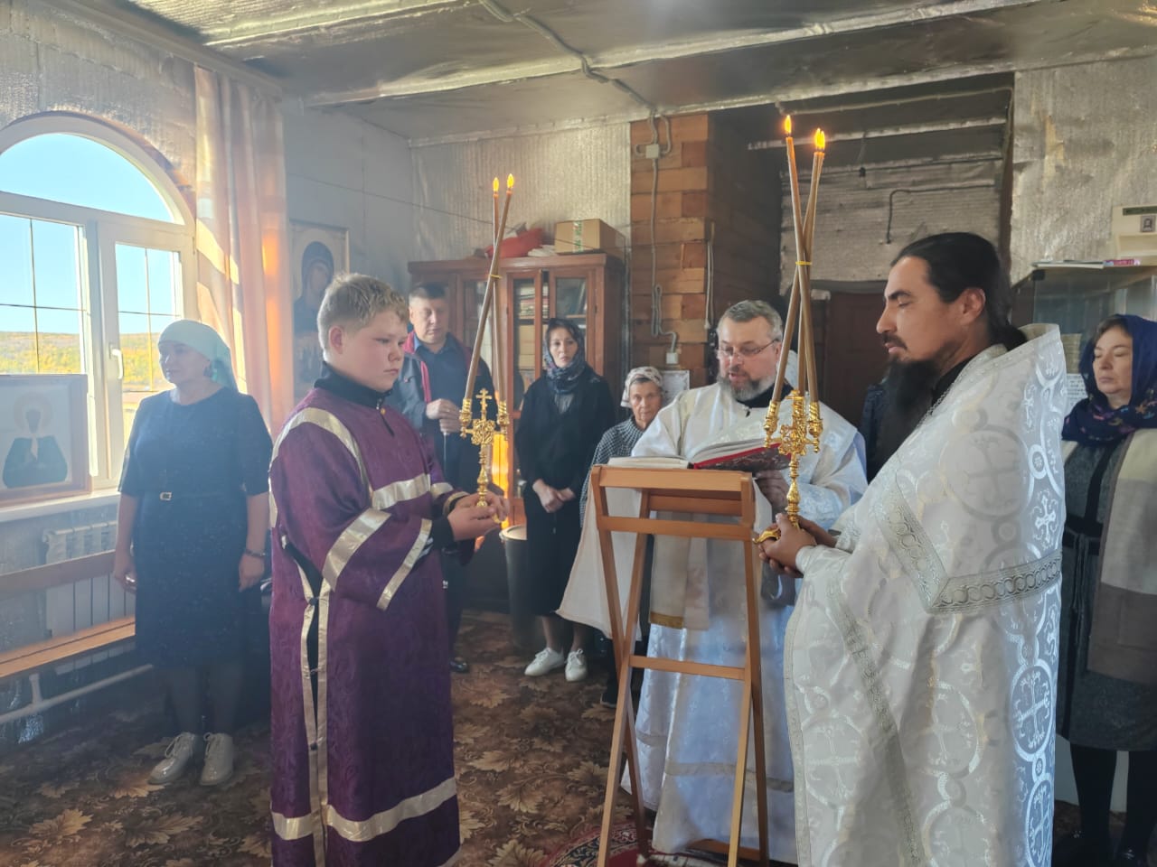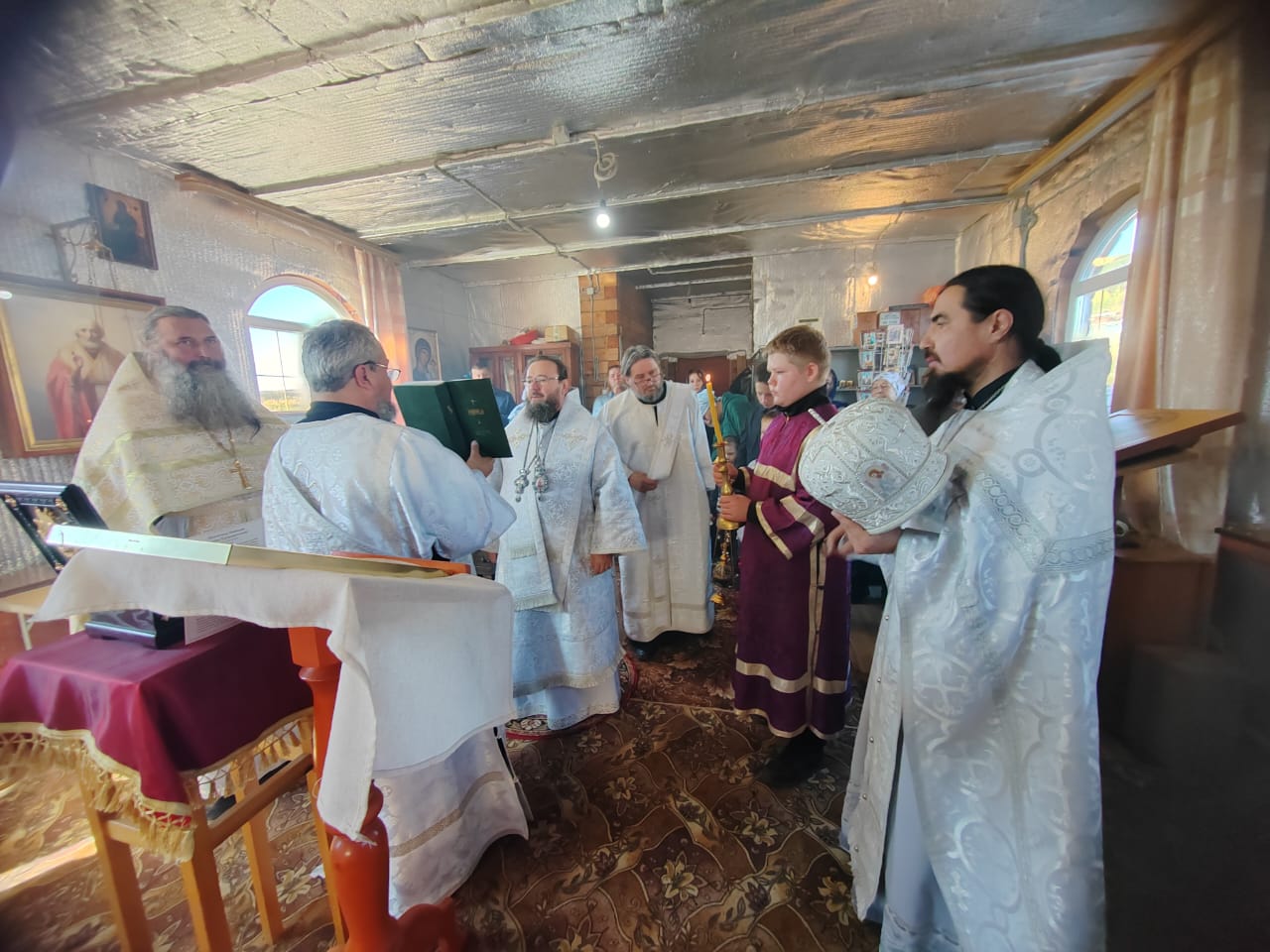 Его Преосвященству сослужили: настоятель Михаило-Архангельского храма в с. Верх-Усугли протоиерей Александр Тылькевич; ключарь кафедрального собора Воскресения Христова г. Нерчинска иерей Роман Пичуев.