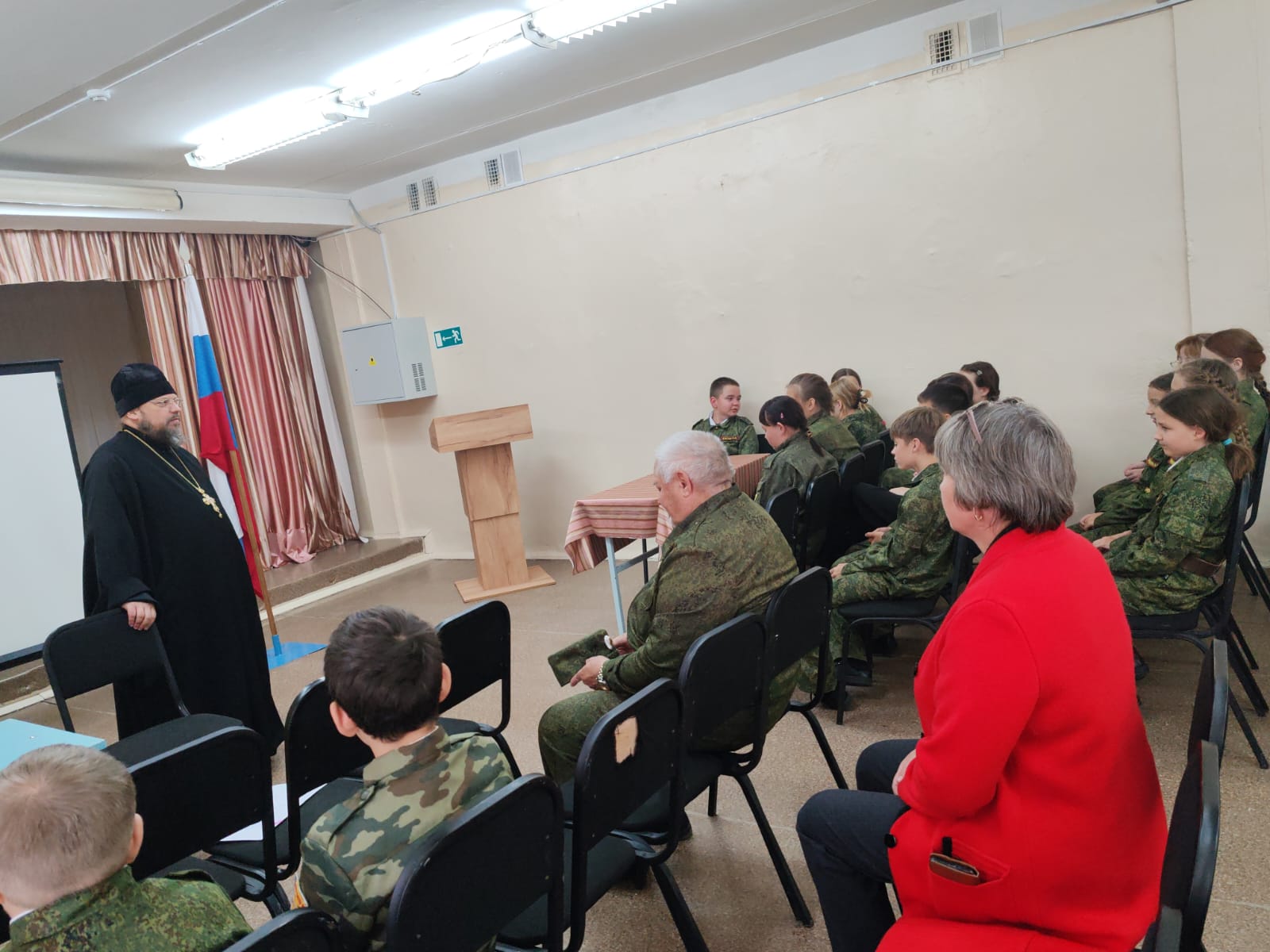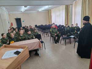 Также отец Симеон рассказал о выдающихся личностях, которые воплощали в себе идеалы веры, служения Отечеству и высокого морального духа — благоверном великом князе Александре Невском и преподобном Сергии Радонежском. Игумен Симеон подчеркнул важность их духовного подвига, мудрости в управлении и способности объединять людей во имя общей цели. Священник призвал кадетов следовать их примеру в стремлении к знаниям, нравственности и самосовершенствованию.