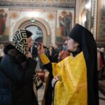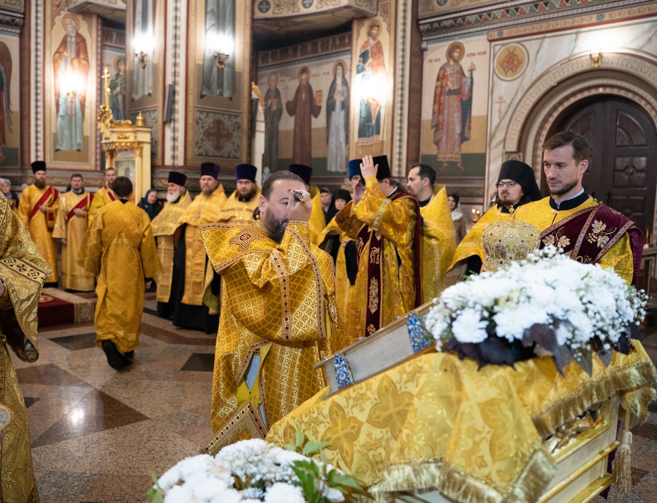 Во время всенощного бдения были совершены великая вечерня, утреня с чтением Евангелия и помазанием всех молящихся освященным елеем.