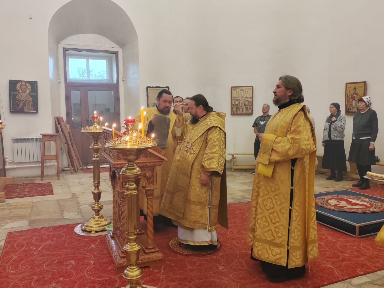 Во время всенощного бдения были совершены великая вечерня, лития с освящением хлебов, вина и елея, утреня с чтением Евангелия и помазанием всех молящихся освященным елеем.