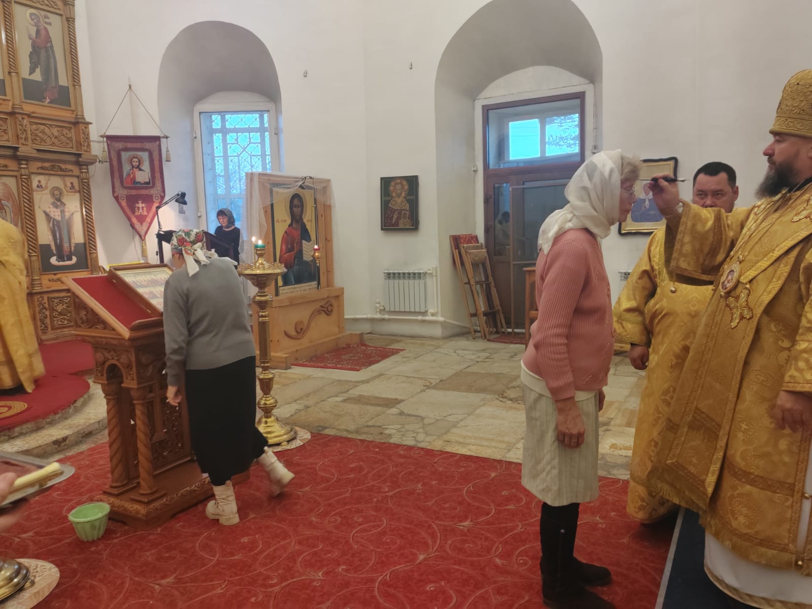 Во время всенощного бдения были совершены великая вечерня, лития с освящением хлебов, вина и елея, утреня с чтением Евангелия и помазанием всех молящихся освященным елеем.