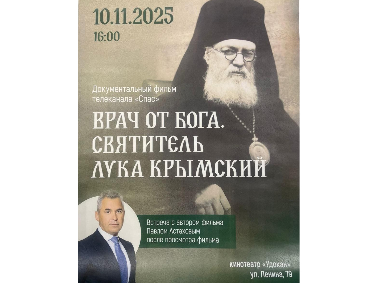 Столица Забайкалья 10 ноября станет первым городом на Дальнем Востоке, где откроют бюст святителя, хирурга Луки Крымского — в миру Валентина Феликсовича Войно-Ясенецкого. В этот же день в кинотеатре «Удокан» в 16.00 пройдёт свободный показ фильма телеканала «Спас» «Врач от Бога. Святитель Лука Крымский», а также встреча с его автором — телеведущим, заслуженным юристом РФ Павлом Астаховым.