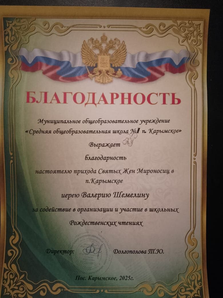 Также священник отметил: «Рождественские чтения в Карымской средней школе стали примером того, как можно объединить образовательный процесс и духовное воспитание, создавая условия для формирования гармоничной и ответственной личности. Надеемся, что подобные мероприятия будут продолжаться и в будущем, вдохновляя детей на добрые поступки и укрепляя их духовные корни. В условиях современного мира, где часто преобладают материальные ценности, такие встречи напоминают о вечных истинах — о добре, любви, вере и надежде».