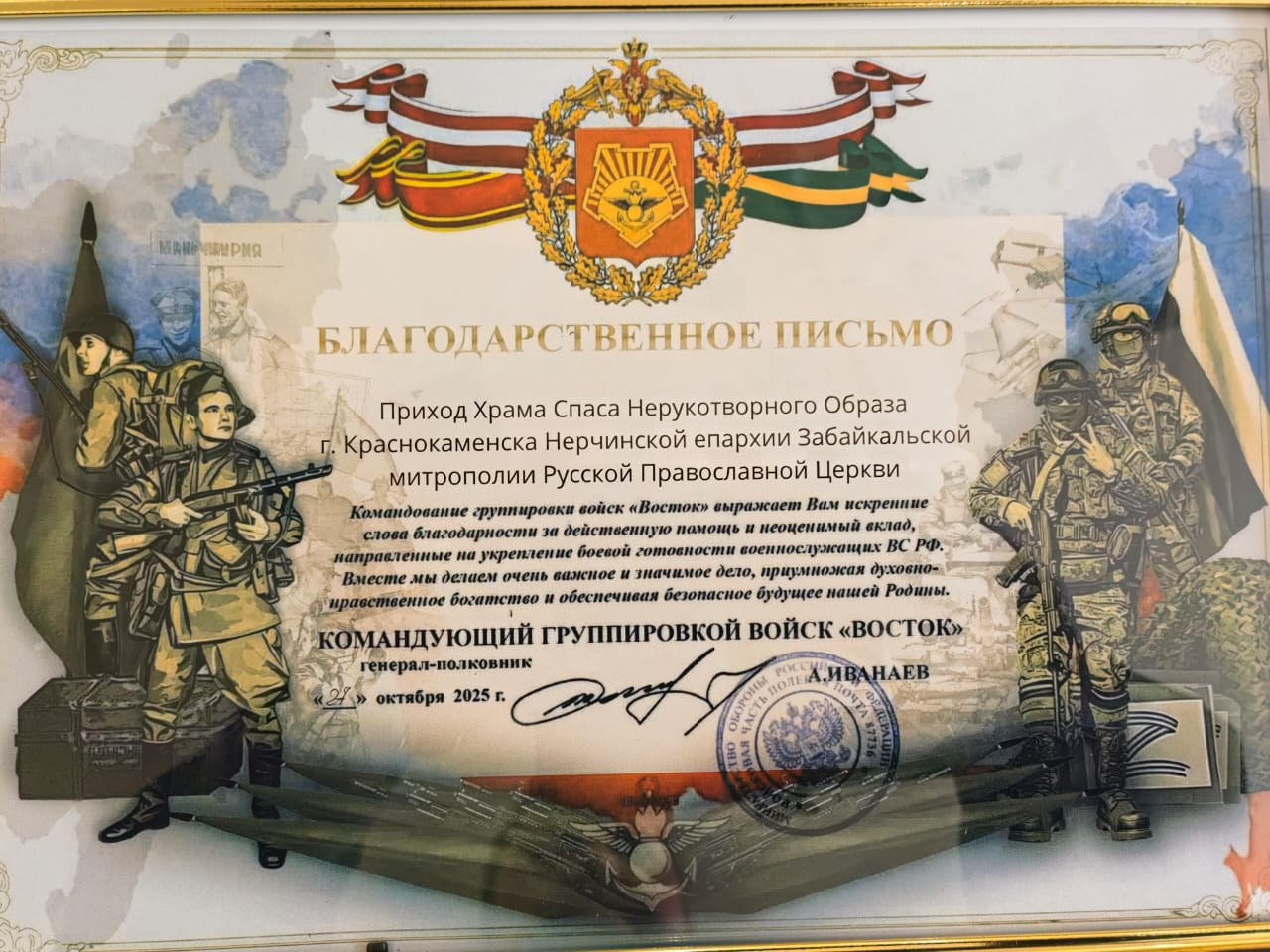 Краснокаменскому приходу вручили Благодарственное письмо от командующего группировкой войск «Восток»