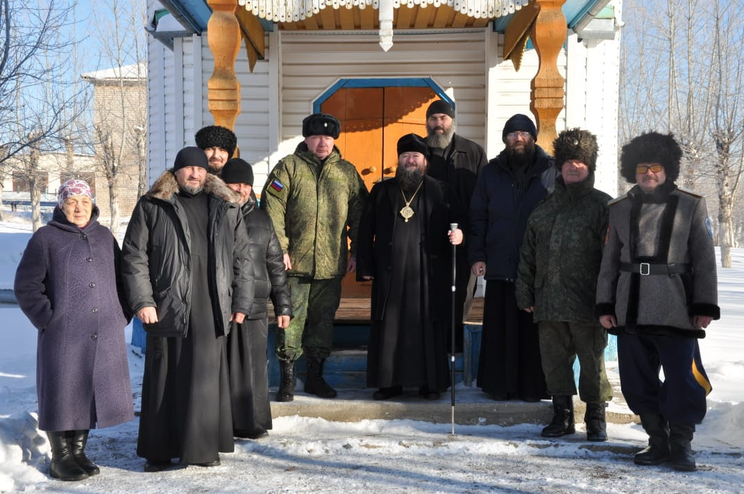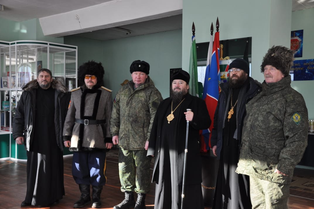 30 ноября 2024 года, по окончании Божественной литургии в храме Владимирской иконы Божией Матери в пгт. Кокуй Сретенского района, епископ Нерчинский и Краснокаменский Макарий посетил пограничный отряд в расположенный в поселке Кокуй. Его Преосвященство сопровождали: настоятель храма Владимирской иконы Божией Матери в пгт. Кокуй протоиерей Андрей Кисов; клирик Воскресенского кафедрального собора г. Нерчинска иерей Роман Пичуев; диакон Андрей Окладников; заместитель руководителя пограничного отряда; атаман станичного казачьего общества «Сретенская станица» Черновец Евгений Иванович; старейшина казачьего общества подъесаул Томилов Виктор Иванович. На территории пограничного отряда находится храм-часовня в честь святого благоверного великого князя Димитрия Донского. Небольшой деревянный храм был построен в 2005-м году. В храме-часовне владыка прочитал молитву благоверному князю Димитрию Донскому и вместе сопровождающими его священнослужителями спел кондак, тропарь и величание святому. Так же владыка обратился к присутствующим подчеркнув важность любви к Родине и отметил, что каждый воин должен не только исполнять свой долг, но и помнить о высоких ценностях, которые стоят за этой службой. Он призвал всех присутствующих помнить о подвиге князя Димитрия Донского, который в свое время защищал свою землю от врагов и вдохновлял своих соратников на героические поступки. Затем епископ Макарий посетил музей пограничного отряда, где собраны уникальные экспонаты, рассказывающие о становлении и развитии отряда с момента его создания в советский период до наших дней. Каждый экспонат имеет свою историю. Владыке Макарию было интересно узнать о том, как менялась служба пограничников, какие вызовы им приходилось преодолевать, и как они защищали границы страны в разные исторические эпохи. В заключение своего визита епископ Макарий поблагодарил военнослужащих за их преданность и службу, пожелав им крепости духа и Божьего благословения в их нелегком деле. ©Нерчинская епархия