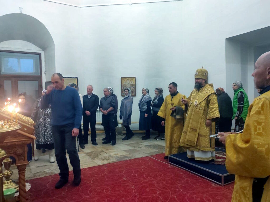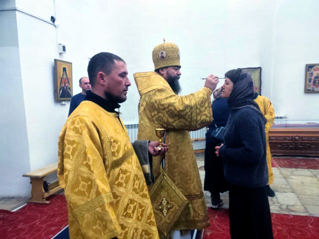 Его Преосвященству сослужили: настоятель храма преподобного Амвросия Оптинского в пгт. Первомайский Шилкинского района иерей Лев Клюев; ключарь кафедрального собора Воскресения Христова г. Нерчинска иерей Роман Пичуев.