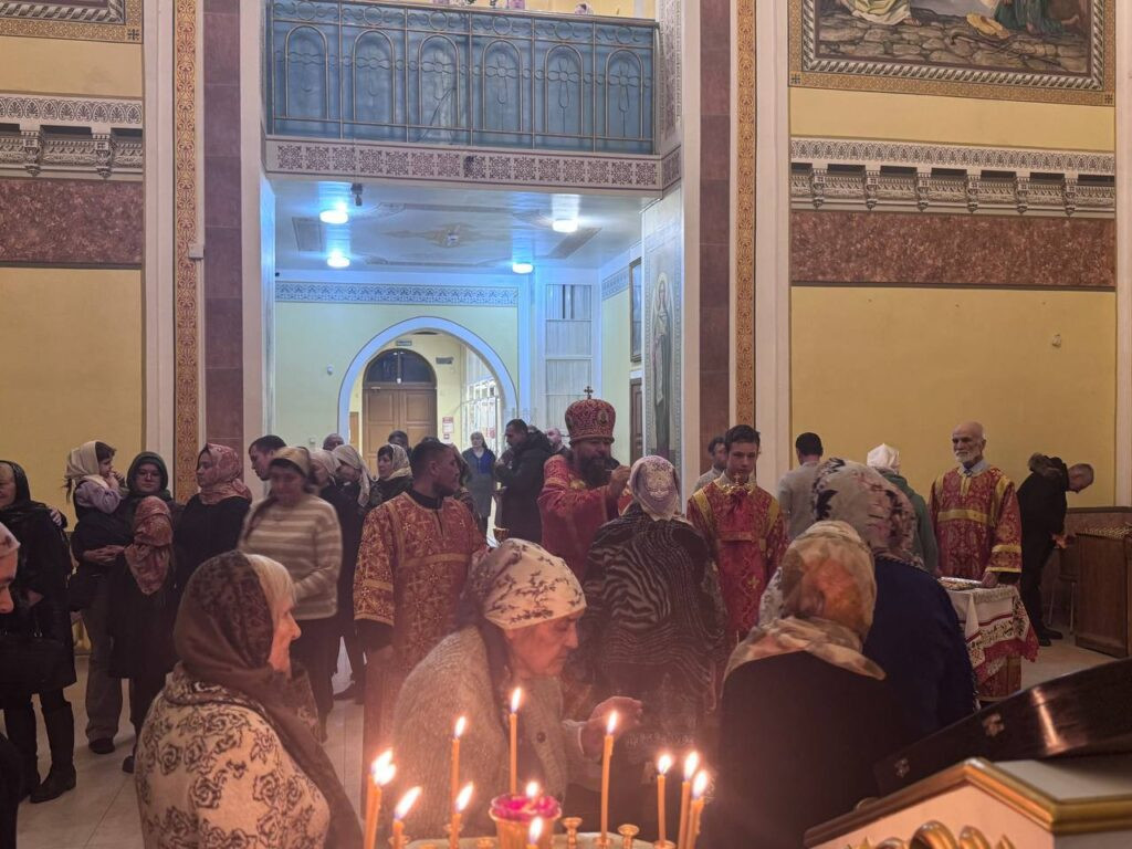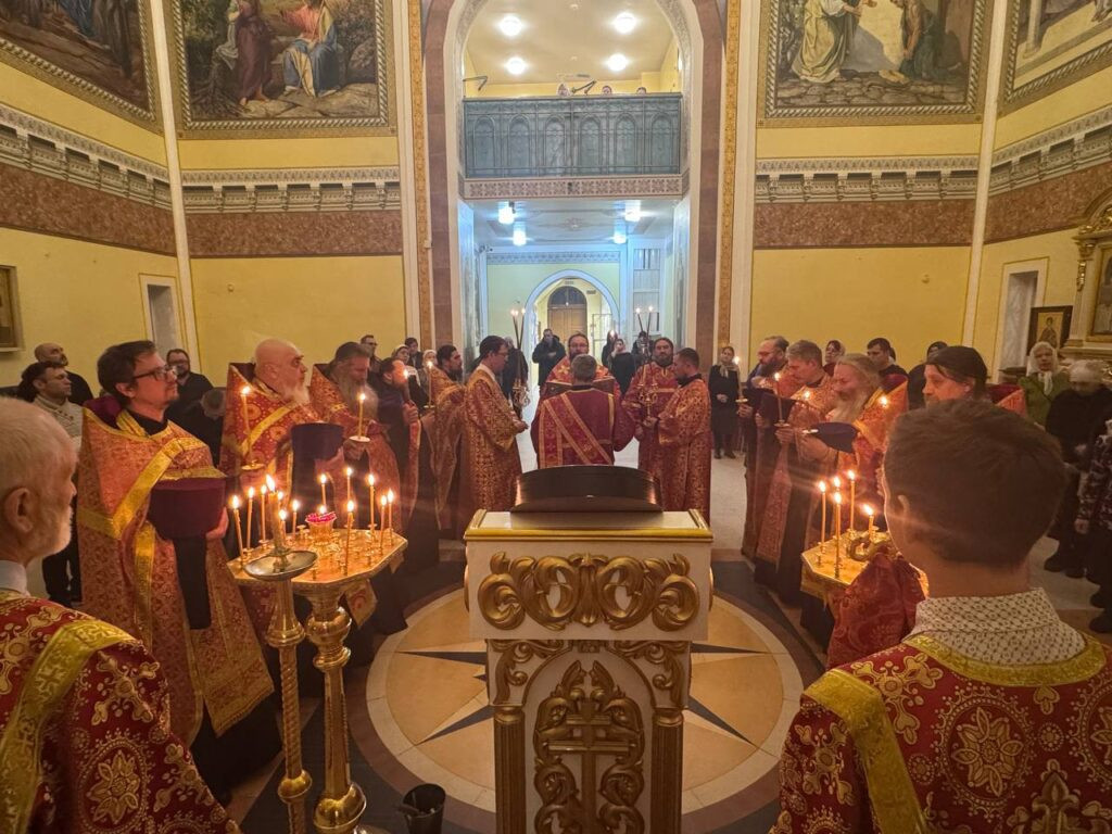 Во время всенощного бдения были совершены великая вечерня, лития с освящением хлебов, вина и елея, утреня с чтением Евангелия и помазанием всех молящихся освященным елеем.