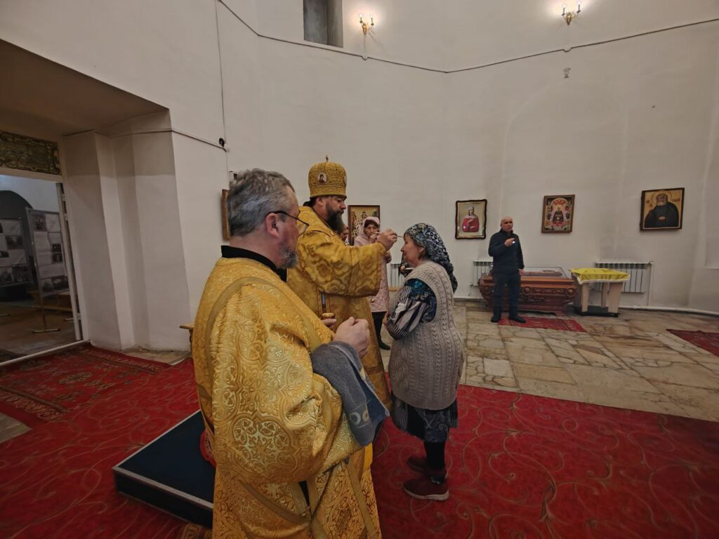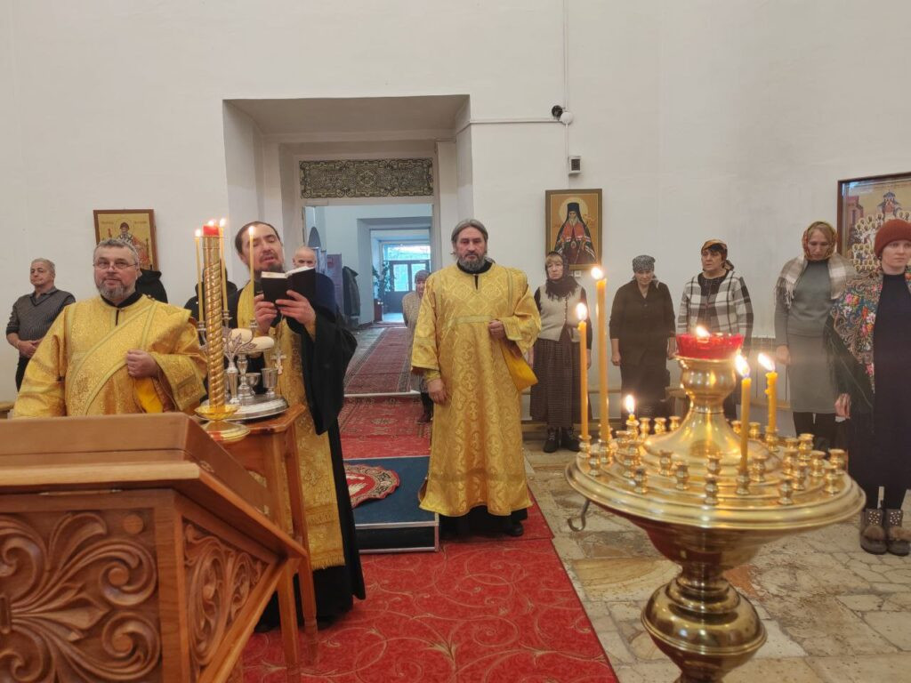 Во время всенощного бдения были совершены великая вечерня, лития с освящением хлебов, вина и елея, утреня с чтением Евангелия и помазанием всех молящихся освященным елеем.