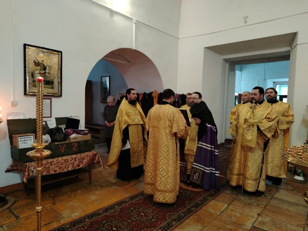Во время всенощного бдения были совершены великая вечерня, лития с освящением хлебов, вина и елея, утреня с чтением Евангелия и помазанием всех молящихся освященным елеем.