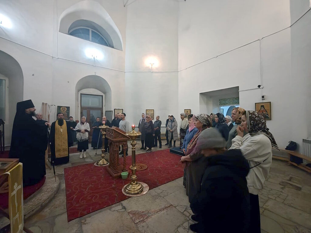 Во время всенощного бдения были совершены великая вечерня, лития с освящением хлебов, вина и елея, утреня с чтением Евангелия и помазанием всех молящихся освященным елеем.