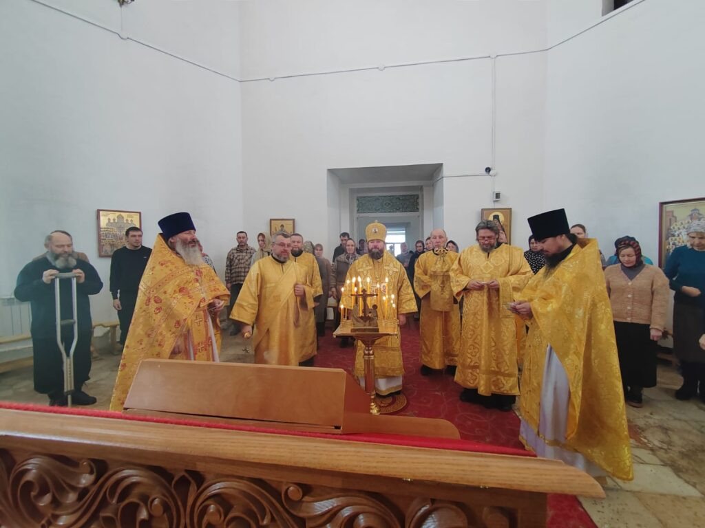 Его Преосвященству сослужили: настоятель храма святителя Николая Чудотворца пгт. Карымское иерей Валерий Шемелин; ключарь кафедрального собора Воскресения Христова г. Нерчинска иерей Роман Пичуев.