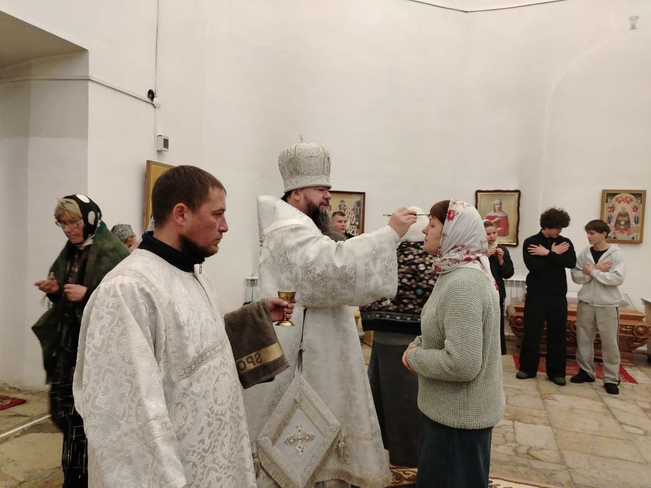 Во время всенощного бдения были совершены: великая вечерня, лития с освящением хлебов, вина и елея, утреня с чтением Евангелия и помазанием всех молящихся освященным елеем.