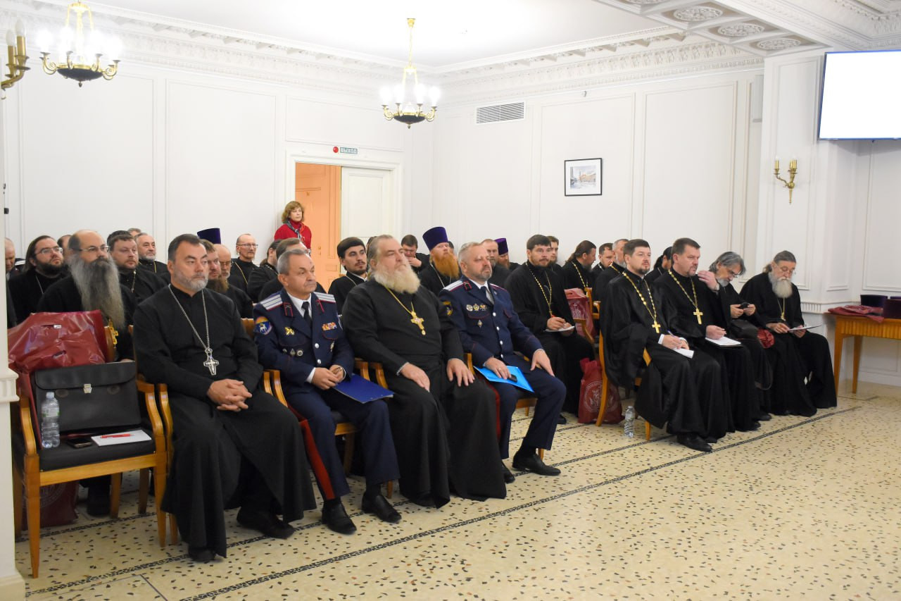 6 октября 2025 года в Общецерковной аспирантуре и докторантуре имени святых равноапостольных Кирилла и Мефодия (ОЦАД) состоялось торжественное открытие курсов повышения квалификации духовенства «Эффективная организация работы епархиального отдела по взаимодействию с казачеством». Мероприятие прошло в актовом зале ОЦАД. Курсы были разработаны совместно с Синодальным комитетом по взаимодействию с казачеством. Церемонию открытия возглавили руководитель отдела по взаимодействию с епархиями и органами власти Синодального комитета по взаимодействию с казачеством иерей Иоанн Малков и начальник отдела дополнительного образования ОЦАД Сергей Любичев. Также в открытии участвовал заместитель начальника Управления Президента РФ по вопросам государственной службы, кадров и противодействия коррупции, ответственный секретарь Совета при Президенте РФ по делам казачества Алексей Кириченко. Было оглашено приветствие председателя Синодального комитета по взаимодействию с казачеством, председателя Синодального отдела по взаимодействию с Вооруженными силами и правоохранительными органами митрополита Ставропольского и Невинномысского Кирилла. «Главной целью всей нашей работы должно стать воцерковление членов казачьих общин и глубокое, осознанное вовлечение казаков в литургическую жизнь Церкви. Казак, живущий полноценной церковной жизнью, участвующий в Таинствах, — это не просто воин, но и подлинный свидетель Христовой веры. Наша общая задача — сделать так, чтобы каждый казак, от мала до велика, чувствовал себя неотъемлемой частью церковной общины», — отметил архиерей. С приветственными словами выступили Алексей Кириченко и Сергей Любичев. Обучение направлено на повышение компетенции руководителей и сотрудников профильных епархиальных структур в вопросах взаимодействия с органами государственной власти, казачьими обществами и образовательными организациями для просвещения казаков и сохранения их традиций. В программу вошли выступления священнослужителей, специалистов из различных сфер, включая представителей государственной власти, казачества, преподавателей московских вузов, атаманов войсковых казачьих обществ и войсковых священников. Участниками курсов стали руководители епархиальных отделов по взаимодействию с казачеством и казачьи духовники со всей России. По благословению епископа Нерчинского и Краснокаменского Макария в программе участвует руководитель отдела по взаимодействию с казачеством Нерчинской епархии иерей Роман Пичуев. Курсы повышения квалификации на базе Общецерковной аспирантуры и докторантуры продлятся до 9 октября. ©Нерчинская епархия
