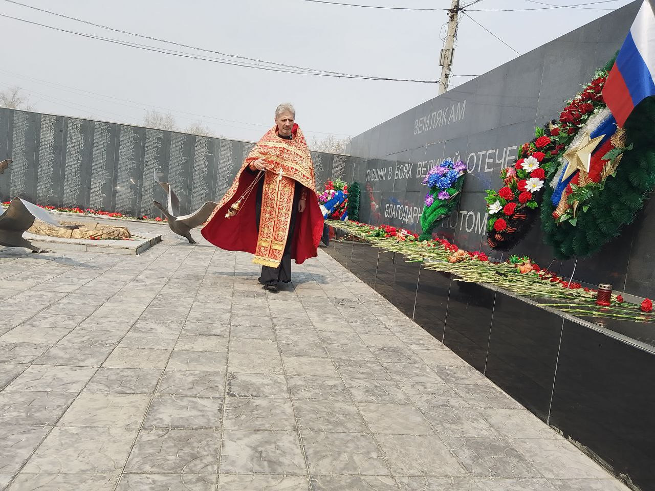 По благословению епископа Нерчинского и Краснокаменского Макария, клирик храма преподобного Сергия Радонежского г. Борзя протоиерей Ростислав Зинченко совершил благодарственный молебен Господу Богу за дарование Победы в Великой Отечественной войне 1941-1945 годов. Богослужение совершалось в честь 80 -й годовщины Победы в Великой Отечественной войне, на мемориале «Землякам, павшим в боях Великой Отечественной. Благодарные потомки» в Борзе. За богослужение молились прихожане храма преподобного Сергия Радонежского. После молебна священник обратился со словом проповеди и напомнил о важности сохранения памяти о героях Великой Отечественной войны, подчеркнув важность сохранения истории и передачи её будущим поколениям. Завершилось мероприятие возложением цветов к подножию мемориала. ©Нерчинская епархия
