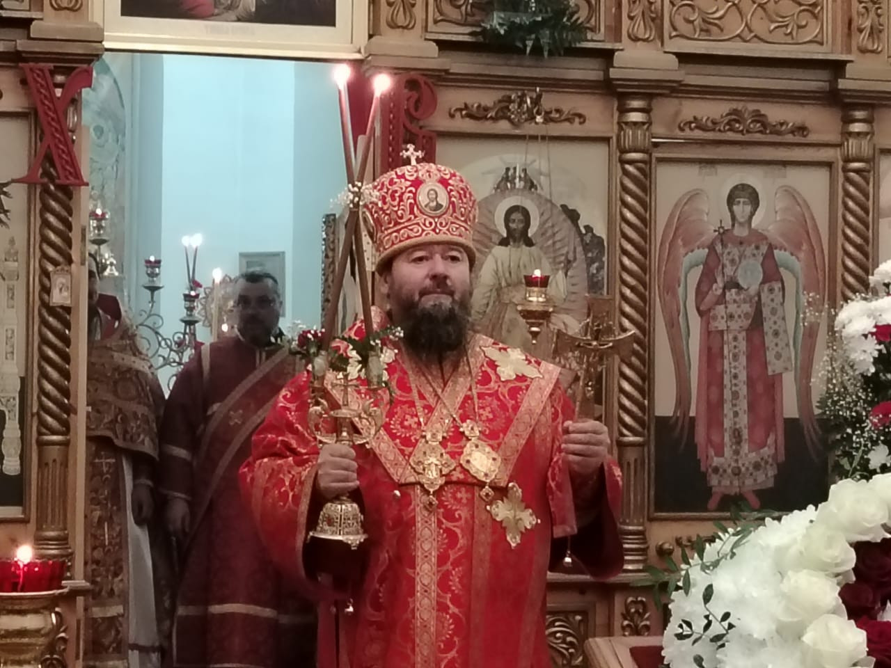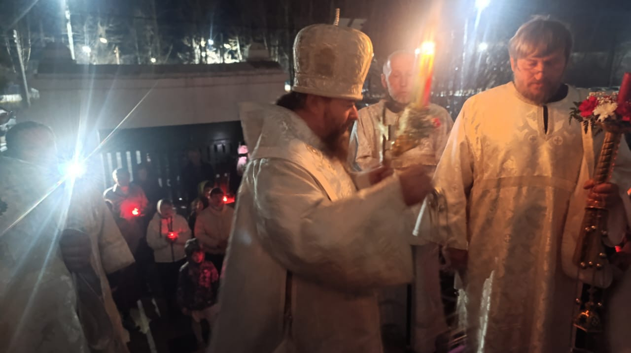 В ночь с 19 на 20 апреля 2025 года, в кафедральном соборе Воскресения Христова в Нерчинске, епископ Нерчинский и Краснокаменский Макарий совершил Пасхальные богослужения — полунощницу, крестный ход, Пасхальную заутреню и Божественную литургию святителя Иоанна Златоуста. Его Преосвященству сослужил клирик Воскресенского кафедрального собора г. Нерчинска иерей Роман Пичуев. Диаконский чин: диакон Андрей Окладников, диакон Игорь Радьков. Богослужебные песнопения исполнил хор Воскресенского кафедрального собора г. Нерчинска. Под пение стихиры «Воскресение Твое, Христе Спасе» был совершен крестный ход вокруг кафедрального собора. В конце Пасхальной заутрени епископ Макарий прочитал Слово огласительное святителя Иоанна Златоуста на Святую Пасху. По чтении Евангелия епископ Макарий огласил Пасхальное послание Святейшего Патриарха Кирилла архипастырям, пастырям, диаконам, монашествующим и всем верным чадам Русской Православной Церкви. На Литургии по благословению Святейшего Патриарха Московского и всея Руси Кирилла на сугубой ектении были вознесены особые прошения и молитва о Святой Руси. Перед причастием иерей Роман Пичуев огласил Пасхальное послание епископа Нерчинского и Краснокаменского Макария. После заамвонной молитвы архипастырь освятил артосы. По окончании богослужения владыка Макарий поздравил верующих с Пасхой Христовой, пожелав им мира, добра, искренней праздничной радости и благополучия во всех делах. Он напомнил о необходимости прощения, милосердия и духовного обновления, призывая прихожан нести свет Христова Воскресения в мир, делясь радостью Пасхи. ©Нерчинская епархия