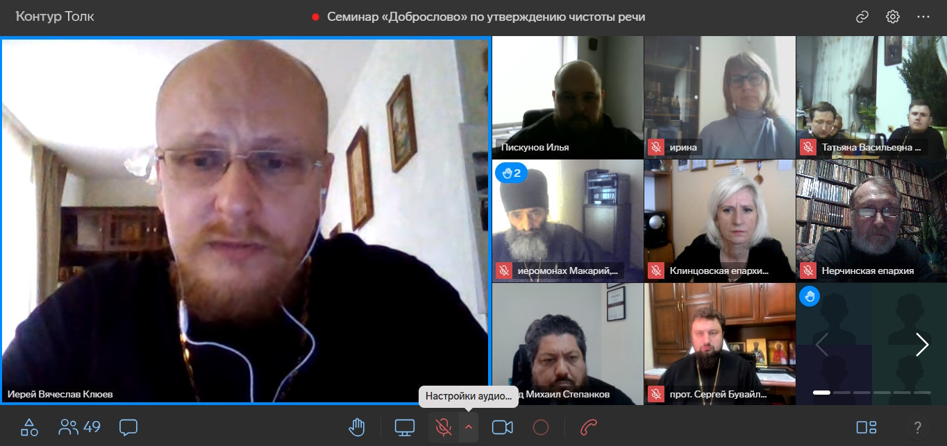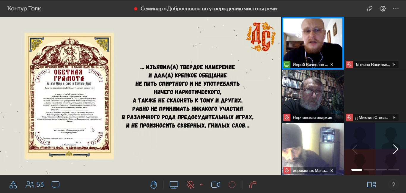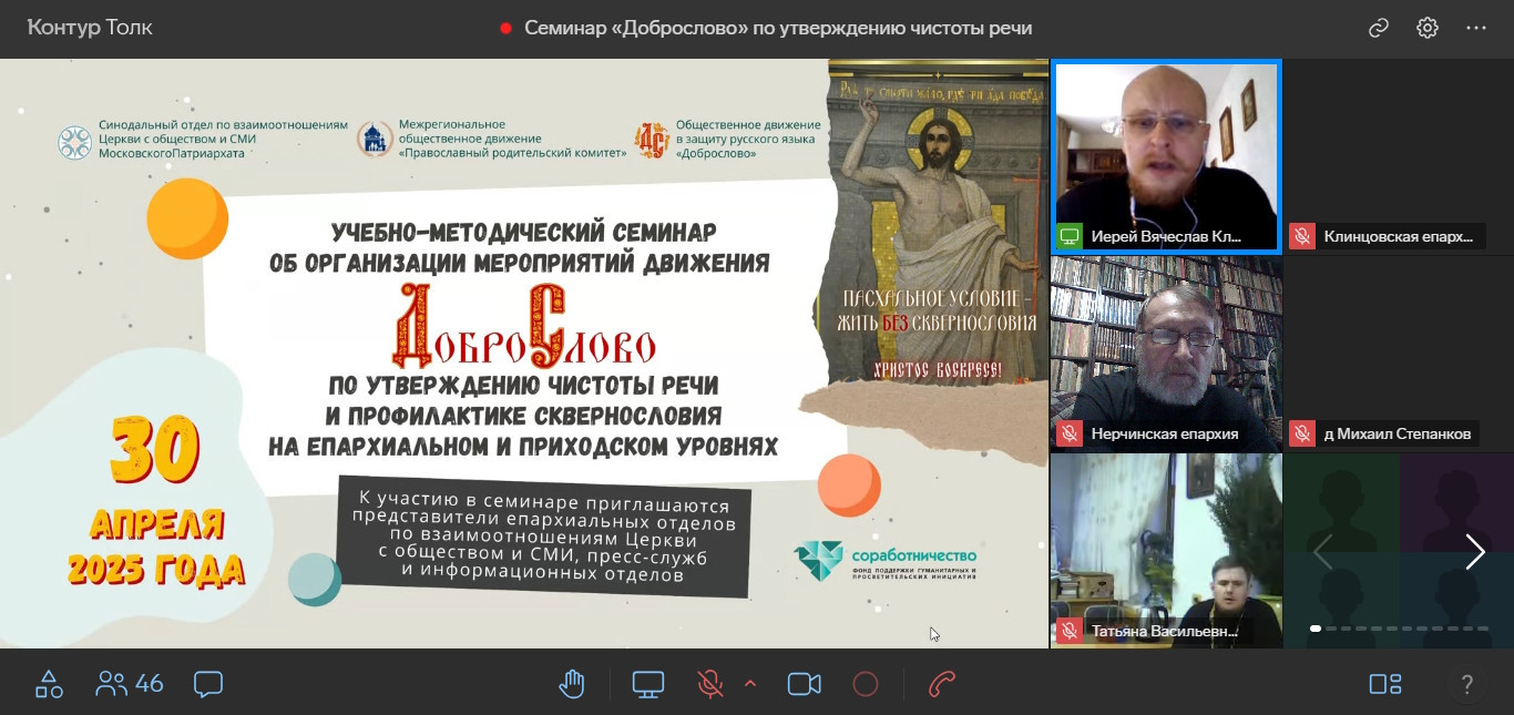 30 апреля 2025 года, по благословению епископа Нерчинского и Краснокаменского Макария, руководитель информационного Отдела Нерчинской епархии Владимир Голубенко принял участие в учебно-методическом семинаре, посвященном организации мероприятий движения «Доброслово» по утверждению чистоты речи и профилактике сквернословия на епархиальном и приходском уровнях. Семинар в формате видеоконференции посредством российского сервиса «Контур.Толк» провел Синодальный отдел по взаимоотношениям Церкви с обществом и СМИ с участием представителя МОД «Православный родительский комитет». Мероприятие провел автор проекта «Доброслово», председатель межрегионального общественного движения в защиту семьи, отцовства, материнства и детства «Православный родительский комитет», председатель Совета отцов города Глазова, руководитель отдела по взаимоотношениям Церкви с обществом и СМИ Глазовской епархии иерей Вячеслав Клюев. Общественно-педагогический проект «Доброслово» направлен на возрождение чистоты речи и профилактику сквернословия в российском обществе, в особенности — в детской среде. На существование данной проблемы неоднократно указывал в своих публичных выступлениях Святейший Патриарх Московский и всея Руси Кирилл. В ходе семинара иерей Вячеслав Клюев рассказал о предпосылках для создания проекта, его истоках, дальнейшем развитии. В настоящее время проект находит свое воплощение на различных уровнях: приходском, епархиальном, муниципальном и региональном. Остановившись подробнее на проводимой работе, спикер сообщил о реализации следующих мероприятий: проведении на приходах бесед, лекций, создании при приходах братств, общин, обществ трезвения, проведении психологических занятий, формировании групп добровольцев, совершении молебнов и молитвенных правил об утверждении чистоты речи, взаимодействии с образовательными и социальными учреждениями, создании информационных материалов и медиапродукции, проведении «недель доброго слова», обозначении «территорий доброго слова» в школах, ВУЗах, администрациях городов и районов, размещении социальной рекламы и т.д. Во второй части своего выступления иерей Вячеслав Клюев поделился с участниками семинара практикой проведения классных часов и родительских собраний на тему «Вирус сквернословия». Были даны рекомендации по структурной организации классных часов, а также приведены конкретные примеры, как привлечь внимание детей и подростков к поднимаемой теме, создать доверительную атмосферу и заинтересовать слушателей, ссылаясь на исторические факты и современные научные исследования. В заключение семинара спикер пригласил участников присоединяться к общественному движению «Доброслово» и реализовать мероприятия в различных регионах. Всего в семинаре приняли участие 57 руководителей и сотрудников епархиальных отделов по взаимоотношениям Церкви с обществом и СМИ, пресс-служб и информационных отделов. ©Нерчинская епархия