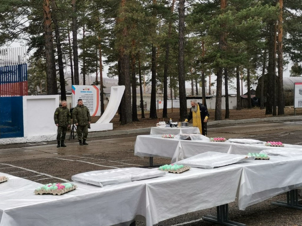 Священнослужитель поздравил военнослужащих с Пасхой 6 мая 2021 2 мая 2021 года иерей Валерий Шемелин поздравил военнослужащих инженерно-саперного полка в Карымском районе с праздником Святой Пасхи, освятил куличи и пасхальные яйца. ©Нерчинская епархия