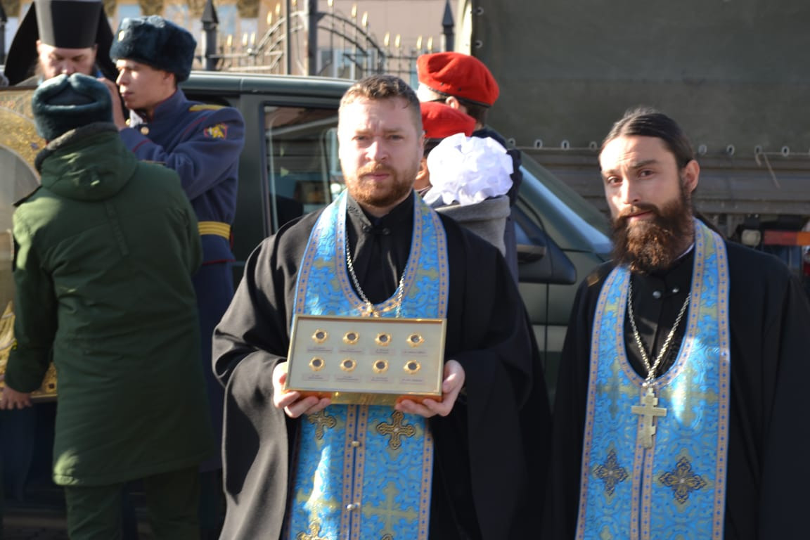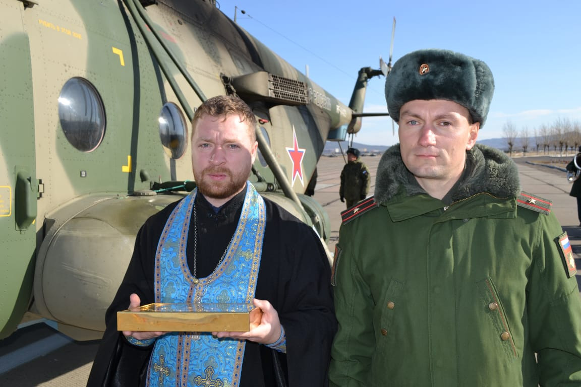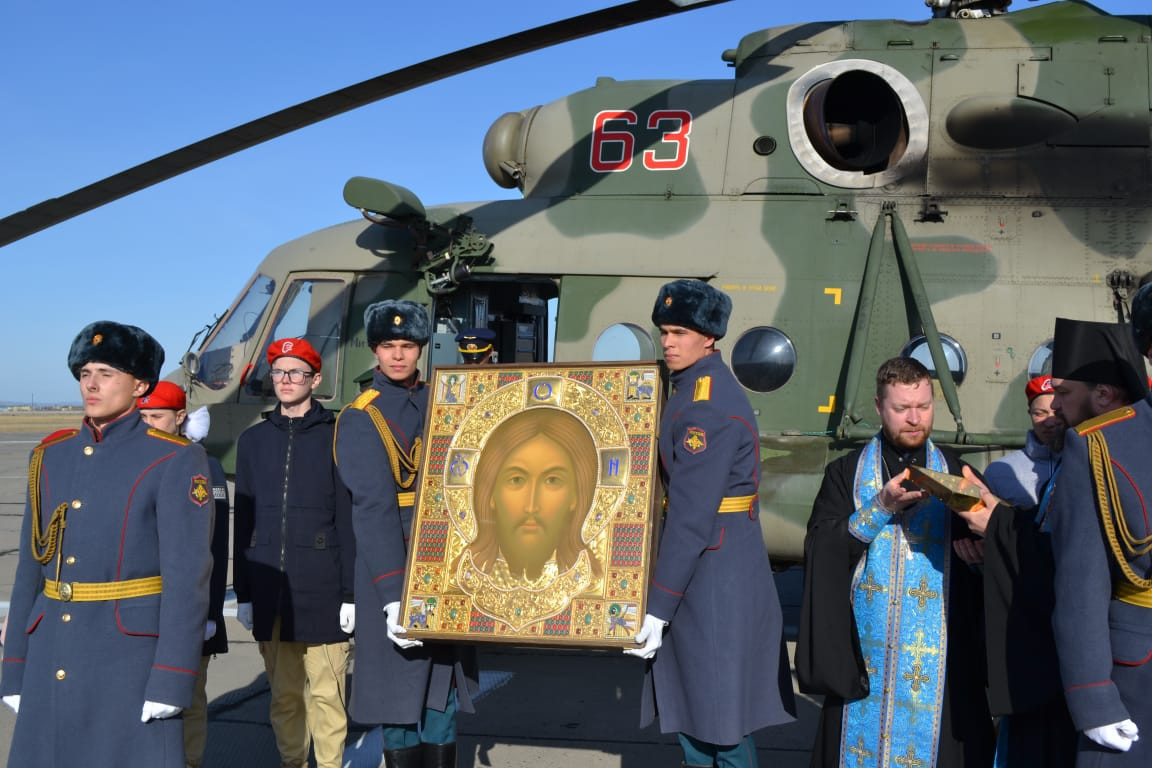 В Забайкалье прибыла главная икона Вооруженных сил РФ «Спас Нерукотворный». Во встрече приняли участие председатель Читинского епархиального отдела по вооруженным силам и правоохранительным органам иеромонах Александр (Михайлов), полковник 29-ой общевойсковой армии Андрей Иванович Горбачев, офицерский состав военных подразделений, Юнармия. По принесению иконы в Казанский кафедральный собор г.Читы состоялся молебен. 15 октября 2019 года в 11:00 в Казанском кафедральном соборе глава Забайкальской митрополии митрополит Читинский и Петровск-Забайкальский Димитрий совершит молебен перед святыней. Приглашаем всех! Икона создана на личные средства Президента России В.В. Путина. Лик Спасителя окружают образы Божией Матери и святых, а рельефы киота изображают знаковые события отечественной истории. Икону сопровождает мощевик с частицами мощей апостолов Петра и Андрея, святителя Николая Чудотворца, великомучеников Пантелеимона и Георгия Победоносца, великомученицы Варвары, преподобного Сергия Радонежского и праведного воина Феодора Ушакова. Святыни пробудет до 21 октября 2019 года.