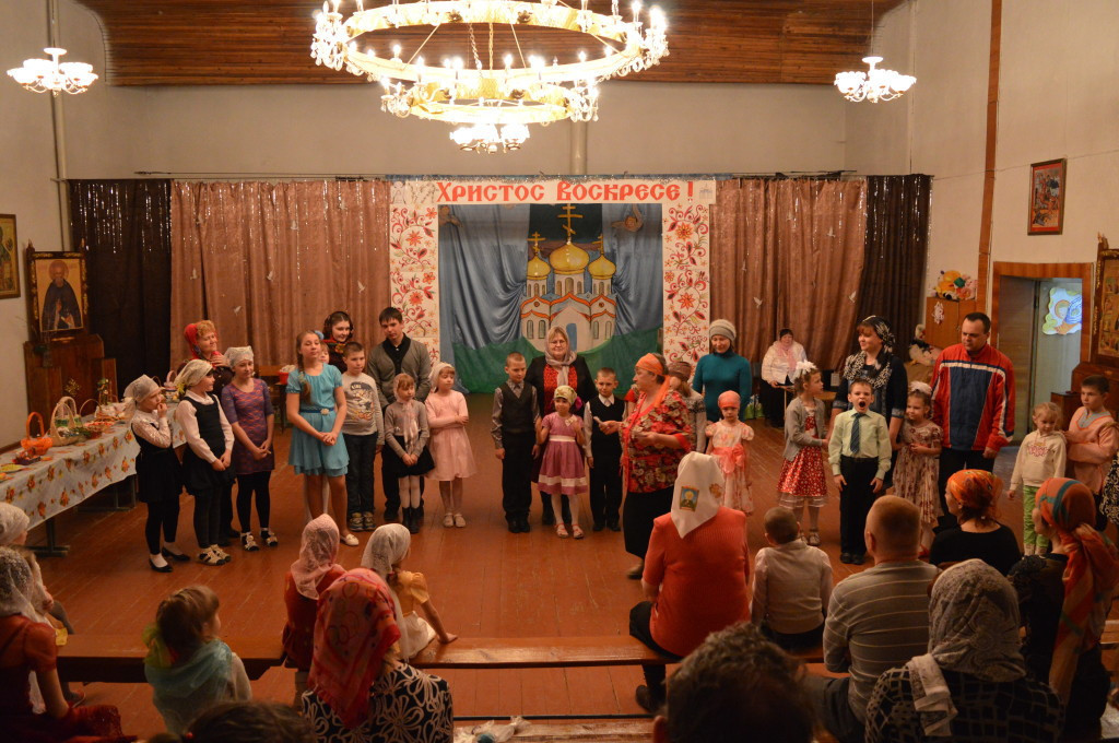 В Светлое Христово Воскресение по благословению настоятеля Спасского храма игумена Симеона (Зимнякова) в воскресной школе состоялся праздник «Пасхальная радость». Красочная афиша в притворе храма сообщала, что приглашаются все желающие. В полдень зазвучали в школе возгласы «Христос Воскресе! Воистину Воскресе!». В зале ряды заполнили родители, прихожане Спасского храма, участники молодежного объединения «Застава». Праздничный тропарь пели все – и юные артисты, и гости. Директор школы — Т.Г. Алявдина поздравила присутствующих с праздником и предложила вспомнить «домашние концерты», которые когда-то дети в семьях готовили исключительно сами – подбирали стихи, разучивали песни, составляли сценарий. Главное в таком концерте – желание поделиться радостью, создать праздничное настроение. Те ребята, которые принимали участие в пасхальной службе, утверждали, что «нисколечко не устали» и именно они в этот день были самыми активными участниками праздника. Звучали стихи о красоте Божьего мира и пробуждении природы, их сменял Псалом 102 в музыкальной обработке для детей — «Благослови, душе моя, Господа!». Трогательная песня «Серый ослик» в исполнении учениц группы «Добро» напоминала о Входе Господнем в Иерусалим. К этой песне девочки прочли стихи о Распятии и Воскресении Господа нашего Иисуса Христа. Настоящей «музыкальной открыткой» стал пасхальный романс «Радостный глас», который Олеся Голикова разучила вместе с мамой. Притча «Небесный гость» в исполнении Светланы Левченко заставила многих задуматься – а не забываем ли мы о чем-то главном в предпраздничной суете. Самые младшие ребята из группа «Зернышки» читали детские стихи о Праздновании Пасхи: о румяных куличах, о первом участии в пасхальной службе, и о маме. Артем Калинкин спел добрую песню «Страна детей». А затем пришел черед русских народных песен, которыми порадовали зрителей Михаил Яковлев и Полина Носырева, Юлия Новокрещеных и хор воскресной школы. Мамы, папы, бабушки вместе с детьми приняли участие в творческой игре «Собери, прочти и оживи стихотворенье». Подвели итоги конкурса на лучшую пасхальную корзинку. С большой любовью и выдумкой родители учащихся вместе с детьми своими руками изготовили корзинки, украсили их лентами и цветами, наполнили расписанными яйцами, куличиками, пасхальными подарками и открытками. Все участники концерта и конкурса получили призы – наборы для творчества, книги, сувениры. Вспомнили и старинные русские игры с пасхальными яйцами, пили чай с куличами. Снова и снова звучал Тропарь Святой Пасхи и радостное приветствие «Христос Воскресе! Воистину Воскресе!». И праздник продолжался – ведь после завершения его в воскресной школе, ребята и взрослые могли помолиться в храме и позвонить в колокол на колокольне Спасского храма. Благочинный Краснокаменского округа игумен Симеон (Зимняков) совершил Пасхальные богослужения в Свято-Вознесенском храме поселка Забайкальск и в строящемся храме во имя свт. Спиридона Тримифунтского поселка Даурия. Настоятель огласил Пасхальное послание Святейшего Патриарха Кирилла и Преосвященного Димитрия, епископа Нерчинского и Краснокаменского, освятил куличи. В завершении поздравил всех прихожан с Светлым Христовым Воскресеньем.