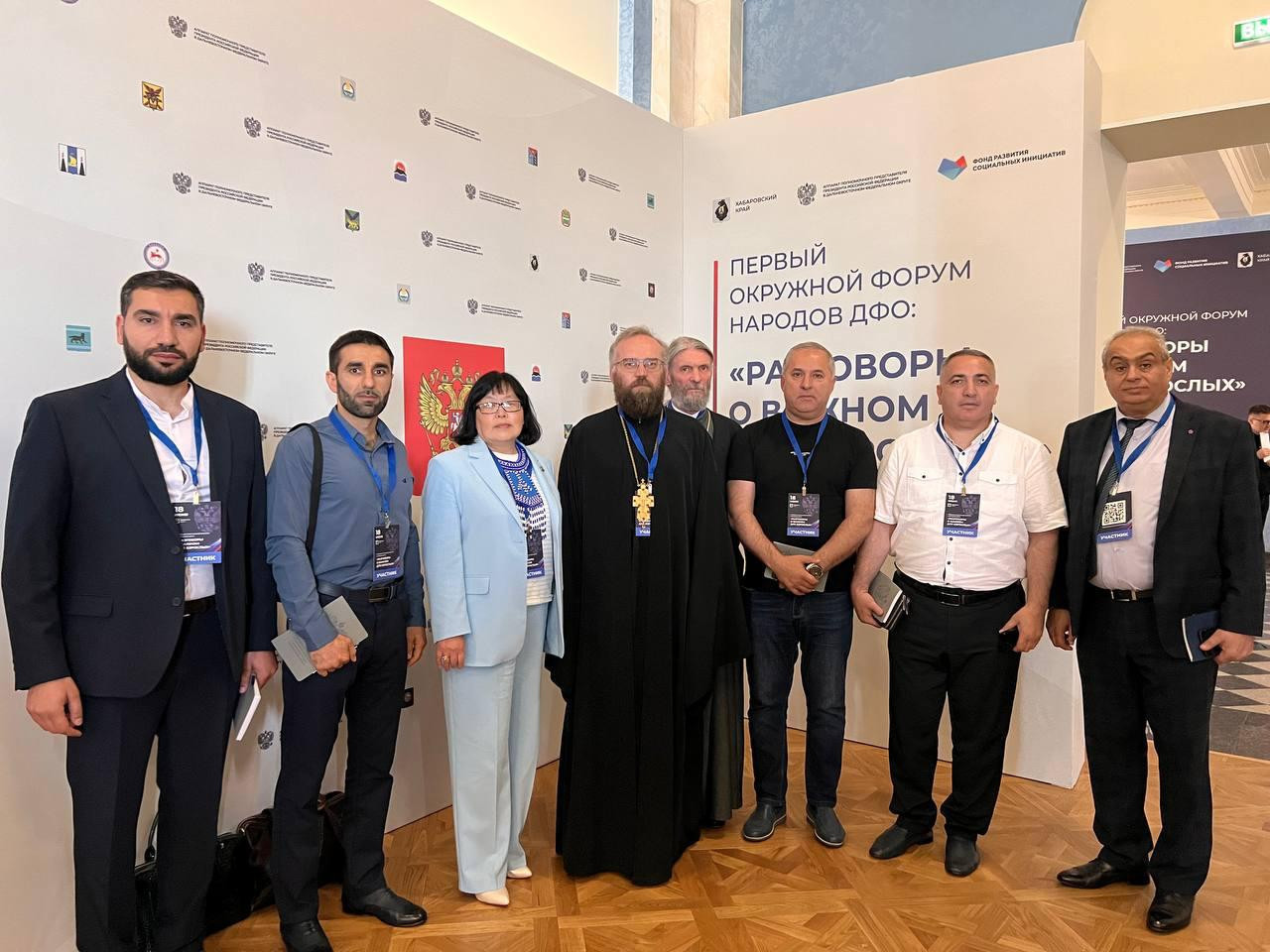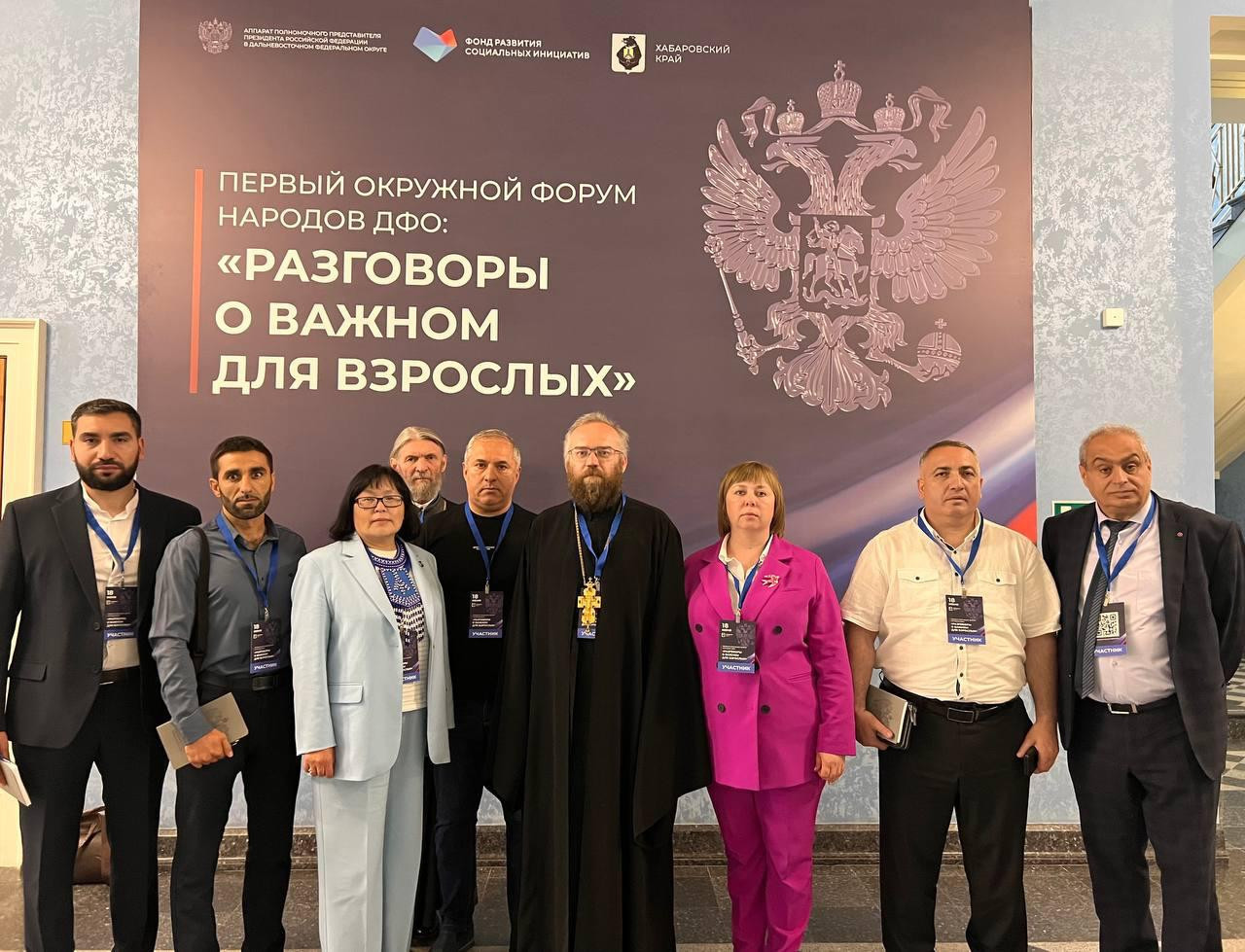 18 июня 2024 года в Хабаровске состоялся Первый окружной форум народов ДФО «Разговоры о важном для взрослых». На его площадке собрались представители администрации президента РФ, Федерального Собрания РФ, члены совета при президенте РФ по межнациональным отношениям, руководители Ассоциации коренных малочисленных народов Севера, Сибири и Дальнего Востока, Ассамблеи народов России, руководители и представители традиционных конфессий, национальных объединений. В числе представителей Забайкалья вице-премьер правительства региона Наталья Щербина, делегаты армянской и азербайджанской диаспор, ассоциации малочисленных народов Севера. Также в форуме приняли участие представители Забайкальской митрополии — руководитель Отдела религиозного образования и катехизации Читинской епархии протоиерей Павел Матвеев и руководитель Отдела религиозного образования и катехизации Нерчинской епархии протоиерей Андрей Кисов. Деловую программу форума открыл заместитель полномочного представителя Президента РФ в ДФО Григорий Куранов. По государственной традиции открытие началось с гимна России. На открытии форума Григорий Куранов зачитал приветственное слово полпреда президента России в ДФО Юрия Трутнева. В дискуссиях форума обсудили вопросы национальной политики, укрепления единства многонациональной страны, а также динамику патриотических настроений внутри ДФО и итоги развития Дальнего Востока. Выступающие говорили о растущих патриотических настроениях, как проявлении сплочения нации, о необходимости воспитания растущего поколения и сохранения исторической памяти, о традиционных ценностях. Поднимались важные темы демографии, миграционной политики, противодействия информационным атакам извне. Лидеры общественного мнения, военкоры, делились впечатлениями о ходе СВО, рассказывали о волонтерской деятельности. «Было много выступлений на тему патриотизма, о том, что патриотизм — это чувство преданности своей стране, гордости за ее историю, культуру и достижения. Патриотическое воспитание играет важную роль в формировании личности и ценностей человека. В семье начинается основа для развития патриотических чувств у ребенка. Родители и близкие люди являются первыми учителями патриотизма, они могут прививать детям уважение к истории своей страны, любовь к ее культуре и традициям. Важно поддерживать общение по патриотическим темам, говорить об истории нашей Родины, объяснять ее достижения и проблемы» — поделился своими впечатлениями о форуме протоиерей Павел Матвеев. ©Нерчинская епархия