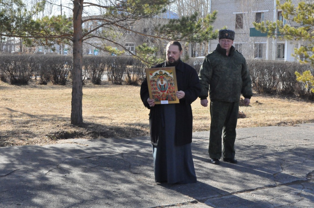 19 октября, настоятель храма Илии Муромского п. Приаргунск игумен Симеон (Зимняков) посетил Службу Пограничного Управления ФСБ России по Забайкальскому краю. Священник провел беседу с сотрудниками Службы и совершил молебен преподобному Варлааму пустыннику Чикойскому. В завершение встречи игумен Симеон (Зимняков) преподнес в дар икону Собора святых покровителей Российского воинства.