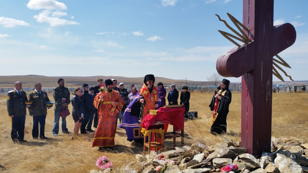 В Оловяннинском районе почтили память воинов, погибших от ран в госпиталях в годы Великой Отечественной войны. На станции Безречная в Оловяннинском районе местное кладбище стало пристанищем для советских солдат, которые так и не смогли оправиться от полученных ранений. Доподлинно известно, что в этих землях лежит более пятисот человек. Но сами местные жители говорят, что если провести исследования, то эта цифра может вырасти в несколько раз. Эти исследования, пожалуй, самое сложное — могилы практически сравнялись с ландшафтом. Пока удалось провести идентификацию останков 538 человек. Их имена будут увековечены на больших плитах, которые установят рядом с крестом. Вероника Дроботова, заместитель руководителя Администрации Оловянинского района: «Предполагается, что здесь захоронено от двух с половиной до трех тысяч умерших от ран в госпиталях. С 1939 по 1945 год». Одиночные и братские могилы, стали местом, куда приходят для того, чтобы воздать честь воинам-освободителям. В Радоницу епископ Нерчинский и Краснокаменский Димитрий в сослужении благочинного Краснокаменского округа игумена Симеона (Зимнякова) совершил панихиду в память воинов, скончавшихся от тяжелых ранений в госпиталях Читы в годы Великой Отечественной войны. За богослужением молились: заместитель руководителя администрации муниципального района «Оловянненский район» по социальной политике Вероника Дмитриевна Дроботова; глава поселения «Безреченское» Маргарита Ильинична Соболева; председатель комитета по культуре и спорту Галина Алексеевна Лотарева; председатель районного совета ветеранов труда и правоохранительных органов Нина Семеновна Селина; атаман станицы «Ясногорская» Владимир Николаевич Космачев; атаман Яснинского караула Иван Иванович Божедомов; старшеклассники Безреченской средней школы. Совершая богослужение на месте погребения воинов, жизнь свою за Отечество положивших, священнослужители еще раз напомнили, что жизнь человека не заканчивается земным пребыванием, но продолжается в вечности с Богом. «В Царствии Божием каждый, в зависимости от своих земных дел или «прославится или постыдится». Новый, возвышенный смысл, в эти пасхальные дни приобретают всем известные слова: «Никто не забыт и ничто не забыто». Души погребенных на этом месте защитников и героев нашей Родины всегда будут пребывать в вечной славе с Воскресшим Спасителем», — отметил епископ Нерчинский и Краснокаменский. Пресс-служба Нерчинской епархии при содействии ГТРК «Чита»