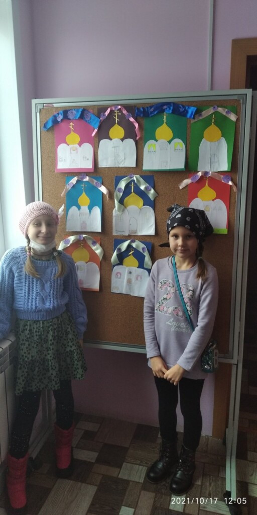 17 октября 2021 в Воскресной школе храма Вознесения Господня в пгт. Забайкальск прошло занятие на тему: «Покров Пресвятой Богородицы». Дети занимались созданием аппликаций и их украшением. Получилось очень оригинальное изображение покрова над храмом.