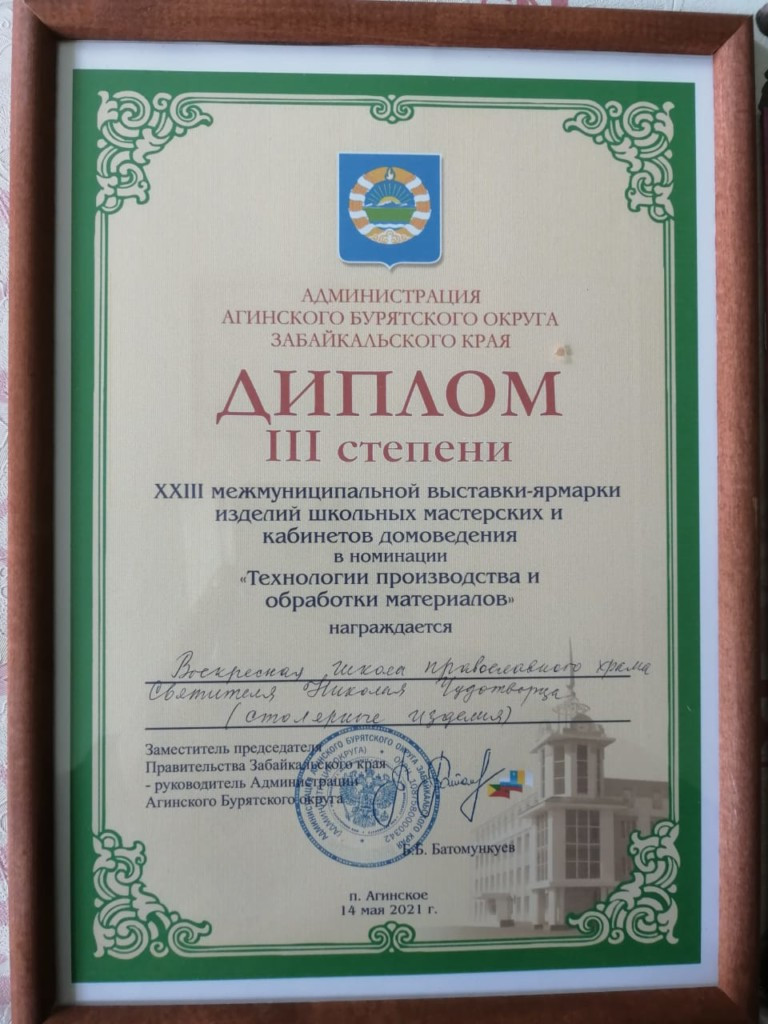 В пгт. Агинское на центральной площади поселка состоялась межмуниципальная выставка-ярмарка изделий школьных мастерских и кабинетов домоведения. В конкурсе приняли участие воспитанники Воскресной школы Свято-Никольского храма. Мальчики представили на выставку-ярмарку различные изделия из дерева, а девочки изготовленные своими руками украшения. Работы заинтересовали посетителей и многие смогли приобрести поделки. Ребята получили диплом третьей степени в номинации «Технологии производства и обработки материалов», хотя это сделать было не просто, так как участников было много. Также в подарок дети получили книжную новинку на бурятском языке Любови Базаровны Батожаргаловой. «Организация такой выставки дает возможность продемонстрировать умение и талант детей, повысить их мотивацию, обменяться опытом», — отмечает начальник отдела социального развития Администрации Агинского Бурятского округа Роза Балдоржиева. ©Нерчинская епархия