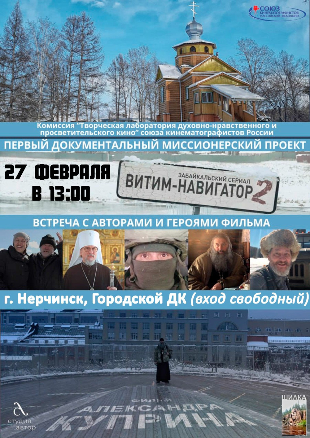 По благословению митрополита Читинского и Петровск-Забайкальского Димитрия, 27 февраля 2024 года в 13:00 в Городском ДК г. Нерчинска состоится показ документального фильма режиссёра Александра Куприна «Витим-Навигатор 2. Забайкальский сериал». Первый документальный миссионерский проект студии «Автор», совместно с кинокомпанией «Шилка» представят авторы и члены съемочной группы. Команда волонтеров под руководством протоиерея Александра Тылькевича, отправляется в гуманитарно-миссионерскую экспедицию в труднодоступные северные районы. Маршрут проходит по одной из самых экстремальных и опасных сибирских рек – Витиму, литературному прообразу «Угрюм-реки». Она и становится главным героем сериала. Фильм снят в жанре роуд-муви (фильм-путешествие, герои которого находятся в дороге), где зритель проходит «маршрут» вместе с героями. Он состоит из восьми серий по 26 минут. Сериал – это микроочерки о людях и судьбах, историях поиска смысла жизни, вере. В фильме очень много семейных историй, драматургия развития личности и завораживающая красота природы. Впервые презентация фильма состоялась 25 января 2024 года в Центральном Доме кинематографистов в Москве в рамках направления «Церковь и культура», (секция «Православие и кино») XXXII Международных Рождественских образовательных чтений.