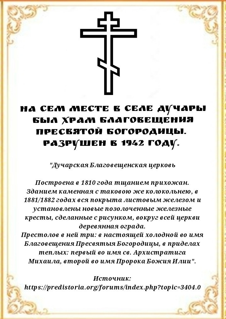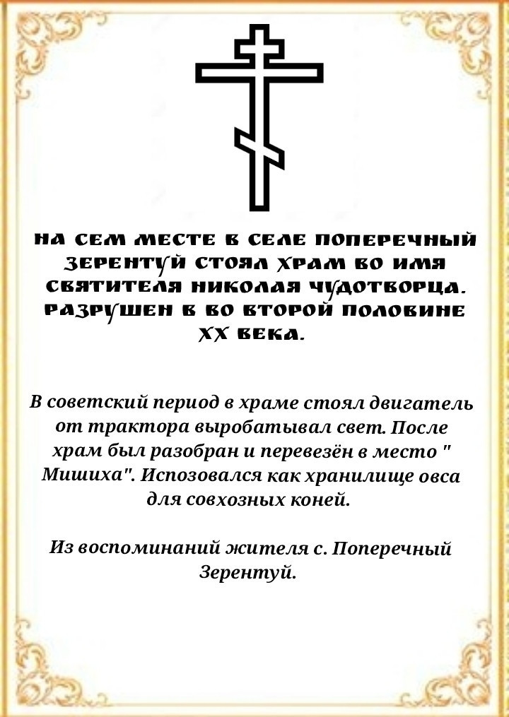 1 октября 2023 года секретарь Нерчинской епархии игумен Симеон (Зимняков) совершил освящение поклонных крестов в селе Поперечный Зерентуй и в селе Дучары Нерчинско-Заводского района. Поперечный Зерентуй являлся казачьим посёлком. На месте поклонного креста в селе ранее стоял храм святителя Николая Чудотворца. Храм голубого цвета с позолоченными крестами разрушили во второй половине ХХ-го века. В советский период в храме стоял двигатель от трактора и вырабатывал свет. Позже храм был разобран и перевезен в место «Микишиха» и использовался как хранилище овса для колхозных коней. На месте поклонного креста в селе Дучары находилась трехпрестольная церковь Благовещения Пресвятой Богородицы, построенная в 1810 году. Еще святитель Софроний, епископ Иркутский и всея Сибири чудотворец в 1762 году дал благословенную грамоту Нерчинскому протопопу Петру Косьмину Пляскину на заложение и построение в Дучарском руднике церкви Благовещения Пресвятой Богородицы. Разрушена в 1942 году. Кресты сделаны и установлены по инициативе уроженца села Поперечный Зерентуй Лопатина Александра Васильевича и помощника настоятеля (церковного старосты) прихода апостола Андрея Первозваного пгт. Дарасун Карымского района Мальцева Владимира Николаевича. ©Нерчинская епархия