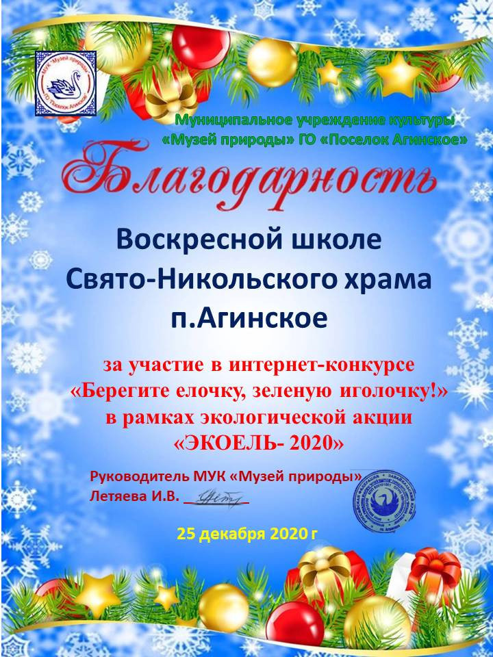 Учащиеся Воскресной школы Свято-Никольского храма пгт. Агинское приняли участие в интернет-конкурсе «Берегите Ёлочку — зеленую иголочку». Организатор конкурса Муниципальное учреждением культуры «Музей природы» городского округа «Поселок Агинское». Дети представили свои работы на фотоконкурс с поделкой экоели из подручных материалов. Из рисунков детей был создан экоплакат. Воскресная школа получила благодарность за участие в конкурсе. ©Нерчинская епархия