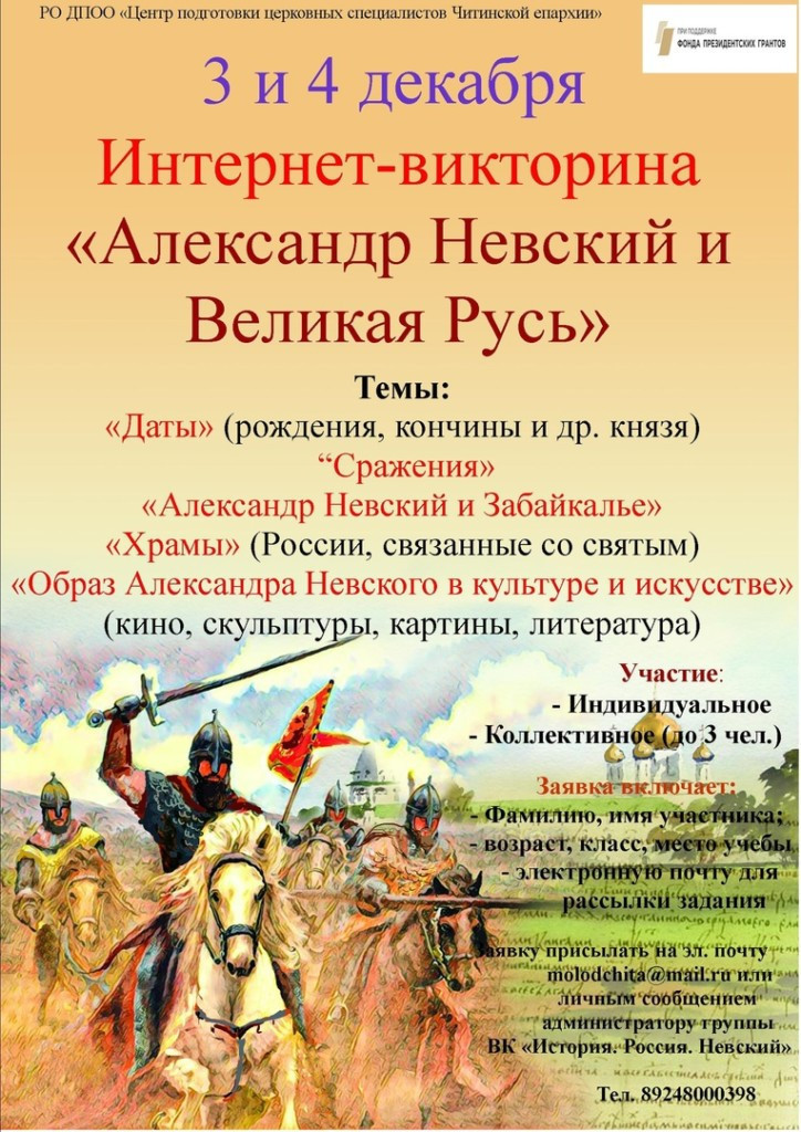 Приглашаем учащихся Воскресных школ, православной гимназии, а также 7-9 классов общеобразовательных школ и воспитанников детских учреждений Забайкальского края к участию в дистанционной интернет-викторине «Александр Невский и Великая Русь», которая пройдет 3-4 декабря 2020 года. Для участия необходимо до 1 декабря подать заявку в свободной форме, чтобы организаторы смогли с Вами связаться и прислать задание, а также после выполнения задания вместе с ответами прислать своё фото (лучше в процессе ответов на задания). Подробности после предоставления заявки или по телефону: 8-924-800-03-98. В заявке указываются фамилия, имя участника, возраст, класс, место учебы и электронная почта для рассылки задания. Заявку необходимо присылать на электронную почту molodchita@mail.ru или в личном сообщении администратору группы ВКонтакте «История. Россия. Невский.» Все участники награждаются сертификатом и сладким сувениром, а победители и призёры получают диплом и подарочные сертификаты ТЦ «ДНС». Викторина проходит в рамках проекта Епархиальные Александро-Невские детско-юношеские чтения, который реализуется с использованием средств гранта Президента Российской Федерации, предоставленного Фондом Президентских грантов в преддверии 800-летия со дня рождения святого благоверного князя Александра Невского.