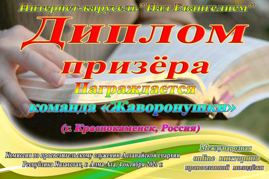 4 октября 2020 года команды из Краснокаменска «Жаворонушки» (Воскресная школа Спасского прихода) и «Подорожник» (Краснокаменский медицинский колледж) открыли сезон Международной молодежной православной Интернет-карусели. В интеллектуальной игре «Над Евангелием» принимали участие сборные школьников и студентов из России, Беларуси, Литвы, Кыргызстана и Узбекистана. Всего в мероприятии были задействованы 27 команд (12 от приходских молодёжных клубов и светских организаций и 15 от воскресных и общеобразовательных школ). В отличие от предыдущих игр, ребята выходили в онлайн с домашних компьютеров, обсуждая вопросы в социальной сети. И это не помешало жарким спорам и радости новых открытий. Команда «Жаворонушки» заняла III призовое место. Обе команды начали подготовку к очередной игре. ©Нерчинская епархия