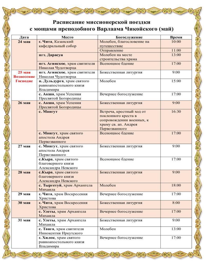 24 мая 2023 года, по благословению митрополита Читинского и Петровск-Забайкальского Димитрия, рака с мощами преподобного Варлаама Чикойского, Забайкальского чудотворца, отправилась на автомобиле в миссионерскую поездку по южным районам Забайкалья. Перед началом миссионерской поездки в Казанском кафедральном соборе в Чите был совершен молебен и получено благословение главы Забайкальской митрополии на путешествие. Раку с мощами сопровождает настоятель храма святых первоверховных апостолов Петра и Павла с. Красный Чикой протоиерей Игорь Хованский. В этот же день настоятель храма святителя Николая Чудотворца пгт. Карымское иерей Валерий Шемелин совершил молебен перед мощами преподобного Варлаама Чикойского на месте строительства храма святого апостола Андрея Первозванного в пгт. Дарасун Карымского района. Далее рака с мощами направится в пгт. Агинское, а затем по южным районам Забайкальского края. К традиционному крестному ходу на празднование иконы Богоматери «Споручница грешных» 11 июня мощи прибудут в монастырь, основанный святым Варлаамом. ©Нерчинская епархия