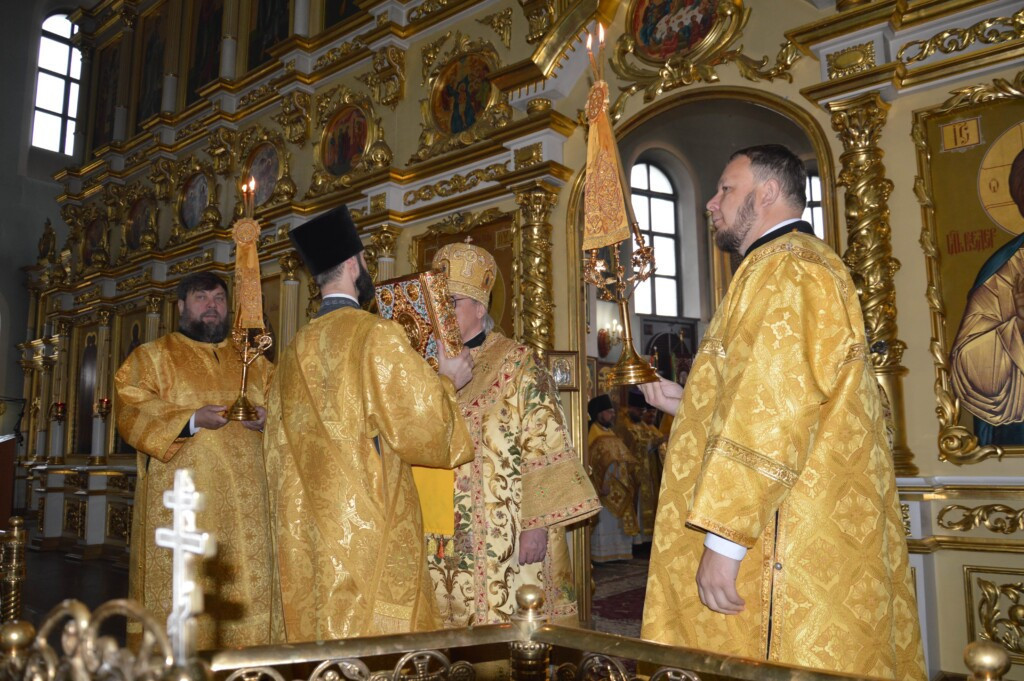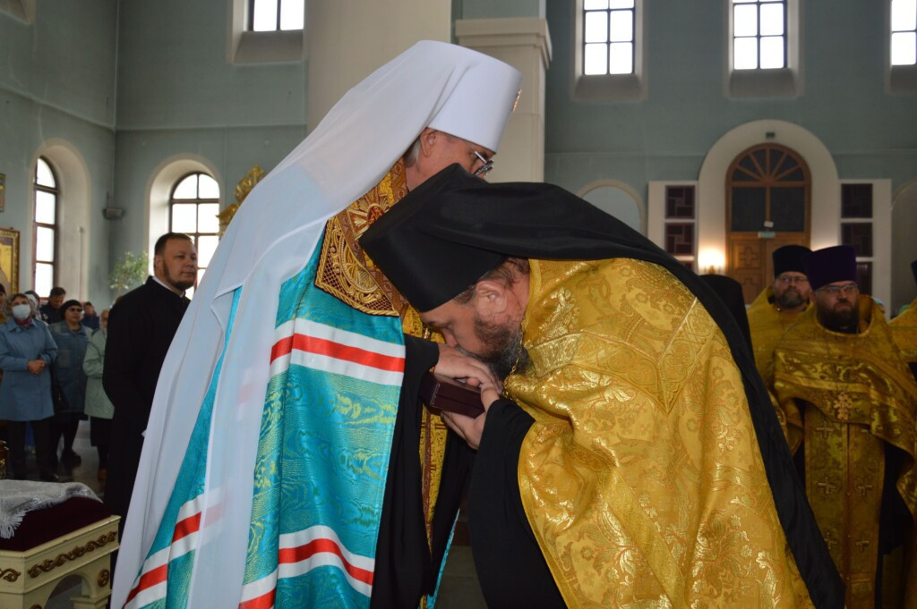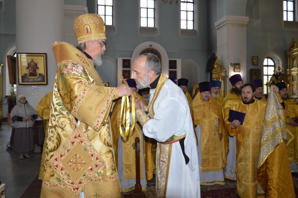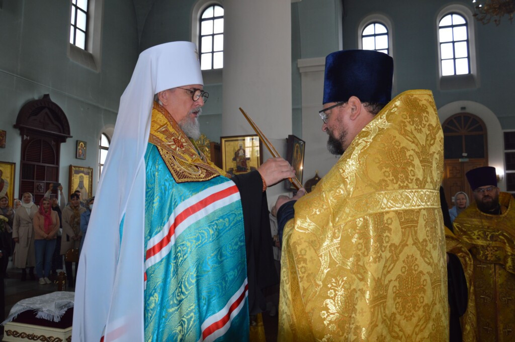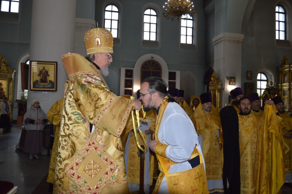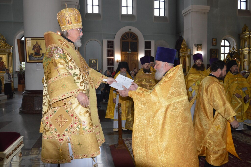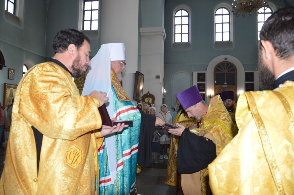 12 сентября 2023 года, в день перенесения мощей благоверного великого князя Александра Невского, митрополит Читинский и Петровск-Забайкальский Димитрий совершил Божественную литургию в кафедральном соборе Казанской иконы Божией Матери в Чите. Его Высокопреосвященству сослужило духовенство Читинской и Нерчинской епархий. Диаконский чин: иеродиакон Иннокентий (Федоров); диаконы Михаил Воробьев и Дионисий Донской. За богослужением молились насельники мужского Успенского монастыря г. Читы, настоятельница женского монастыря в честь Всех святых, в земле Русской просиявших, в пгт. Атамановка игумения Ольга (Василькова) с сестрами обители. Богослужебные песнопения исполнил хор Казанского кафедрального собора г. Читы. На малом входе митрополит Димитрий вручил Патриаршие богослужебно-иерархические награды. Указом Святейшего Патриарха Московского и всея Руси Кирилла по ходатайству митрополита Димитрия во внимание к трудам на благо Святой Церкви и в связи с 25-летием служения в сане пресвитера права служения Божественной литургии с отверстыми Царскими вратами по «Иже херувимы…» удостоен клирик кафедрального собора Казанской иконы Божией Матери города Читы протоиерей Андрей Федотов. Указом Святейшего Патриарха Московского и всея Руси Кирилла по ходатайству митрополита Димитрия во внимание к трудам по строительству храма Ватопедской иконы Божией Матери «Отрада и Утешение» права ношения палицы удостоен настоятель Успенского мужского монастыря города Читы, благочинный монастырей Читинской епархии игумен Софроний (Валов). Указом Святейшего Патриарха Московского и всея Руси Кирилла по ходатайству митрополита Димитрия во внимание к трудам на благо Святой Церкви и в связи с 50-летием со дня рождения права ношения палицы удостоен клирик храма Рождества Христова города Могоча иерей Владимир Смирнов. По благословению Святейшего Патриарха Московского и всея Руси Кирилла на сугубой ектении были вознесены особые прошения и молитва о Святой Руси. Проповедь перед причастием произнес протоиерей Михаил Андрусь, клирик кафедрального собора Казанской иконы Божией Матери г. Читы. По окончании Литургии архипастырь вручил ряд наград духовенству Забайкальской митрополии. Во внимание к трудам по строительству храма святителя Спиридона Тримифунтского поселка Даурия настоятель соборного храма Спаса Нерукотворного Образа города Краснокаменска игумен Симеон (Зимняков) удостоен Патриаршей награды – Ордена Русской Православной Церкви преподобного Сергия Радонежского III степени. Во внимание к мужественному несению архипастырского служения в военных условиях клирик соборного храма Спаса Нерукотворного Образа г. Краснокаменска протоиерей Ростислав Зинченко удостоен Патриаршей награды – медали ордена благоверного князя Димитрия Донского. Во внимание к мужественному несению архипастырского служения в военных условиях настоятель храма благоверного князя Димитрия Донского с. Домна, насельник Успенского мужского монастыря города Читы иеромонах Александр (Михайлов) удостоен Патриаршей награды – медали ордена благоверного князя Димитрия Донского.Установить изображение записи Во внимание к трудам по строительству войскового казачьего храма великомученика Димитрия Солунского города Читы настоятель храма великомученика Дими