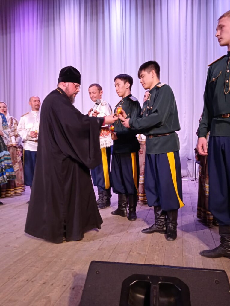 19 апреля 2023 года в среду Светлой седмицы на сцене ДК «Даурия» в г. Краснокаменск состоялся праздничный концерт, посвященный Светлому Христову Воскресению. В рамках фестиваля «Пасхальная весна 2023» ансамбль песни и пляски «Забайкальские казаки» выступил с программой «Пасхальный благовест». Также зрителей поздравили творческие коллективы г. Краснокаменска. Перед началом выступления секретарь Нерчинской епархии игумен Симеон (Зимняков). Он поздравил гостей и краснокаменцев с Великим праздником Пасхи и передал благословение архиепископа митрополита Читинского и Петровск-Забайкальского Димитрия. На сцене звучали песни о вере, любви и надежде, ставшие неотъемлемой частью праздничной программы. Их исполнение зажигало сердца зрителей и дарило им незабываемые эмоции. Не меньшее внимание было уделено традиционной русской культуре. Артисты исполнили народные песни и танцы. Это создавало атмосферу гармонии, в которой каждый мог почувствовать себя частью большой многовековой истории нашей страны. В Нерчинской епархии фестиваль стал замечательным подарком для жителей Борзи, Забайкальска и Приаргунска, помогая им почувствовать радость и единство великого праздника Христова Воскресения. ©Нерчинская епархия
