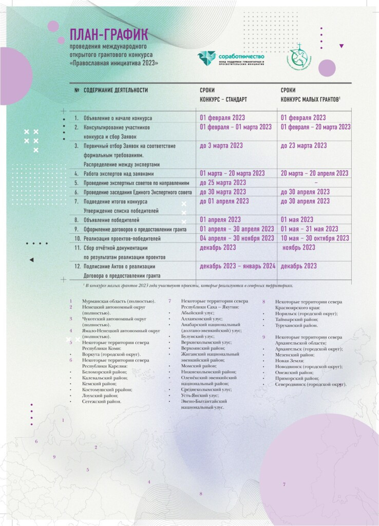 1 февраля 2023 года начнется прием заявок сразу на два конкурса в рамках Международной грантовой программы «Православная инициатива». Приоритетными темами основного конкурса станут: наставничество; воспитание детей в духе любви к своей семье и духовно-нравственным традициям, сохранение и укрепление традиционных семейных ценностей в обществе; экология. Консультирование участников основного конкурса и сбор заявок пройдет с 1 февраля по 1 марта. Далее начнется проверка заявок соответствие формальным требованиям и работа экспертов. Объявление списка победителей основного конкурса должно состояться 1 апреля. В Конкурсе малых грантов участвуют проекты, которые реализуются в северных территориях Российской Федерации. Консультирование участников конкурса малых грантов пройдет с 1 февраля по 22 марта, заявки принимаются до 23 марта. Результаты конкурса малых грантов объявят 1 мая. Подробная информация на сайте ЗДЕСЬ.