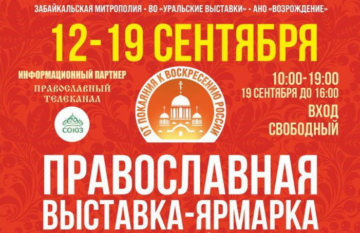 ЧИТИНСКАЯ ЕПАРХИЯ • ВО «УРАЛЬСКИЕ ВЫСТАВКИ» • АНО «ВОЗРОЖДЕНИЕ» г. Чита, ул. Кайдаловская, 24 (Стадион СибВО) 12-19 сентября 2022 г. Ежедневно: экспозиции, посвященные 600-летию со дня обретения мощей прп. Сергия Радонежского и 150-летию со дня рождения св. царицы-страстотерпицы Александры Федоровны Романовой 12 сентября 10.00 — Начало работы выставки- ярмарки 11.00 — Беседы со священниками Читинской епархии 12.00 — Торжественное открытие выставки. Молебен «На начало благого дела», возглавит митрополит Читинский и Петровск- Забайкальский Димитрий 11.00 — Презентация Благотворительного фонда «Светоч», мастер-классы: «Галерея добрых сердец» 15.00 — Молебен с акафистом 15.30 — Видеопрограмма, посвященная прп. Сергию Радонежскому 16.00 — Выступление члена Союза писателей РФ Ангелены Сапрыкиной (Новосибирск) 19.00 — Завершение первого дня работы 13 сентября 10.00 — Начало второго дня работы выставки-ярмарки 11.00 — Молебен «На начало благого дела» 11.00 — Беседы со священниками Читинской епархии 11.00 – Презентация Благотворительного фонда «Светоч», мастер-классы: «Галерея добрых сердец» 15.00 — Молебен с акафистом 15.30 — Видеопрограмма, посвященная прп. Сергию Радонежскому 16.00 — Выступление члена Союза писателей РФ Ангелены Сапрыкиной (Новосибирск) 19.00 — Завершение второго дня работы 14 сентября 10.00 — Начало третьего дня работы выставки-ярмарки 11.00 — Молебен «На начало благого дела» 11.00 — Беседы со священниками Читинской епархии 11.00 — Презентация Благотворительного фонда «Светоч», мастер-классы: «Галерея добрых сердец» 15.00 — Молебен с акафистом 15.30 — Видеопрограмма, посвященная прп. Сергию Радонежскому 16.00 — Презентация школы Культурно-нравственного просвещения «Истоки» 17.00 — Выступление члена Союза писателей РФ Ангелены Сапрыкиной (Новосибирск) 19.00 — Завершение третьего дня работы 15 сентября 10.00 — Начало четвертого дня работы выставки-ярмарки 11.00 — Молебен «На начало благого дела» 11.00 — Беседы со священниками Читинской епархии 11.00 — Выставка Благотворительного фонда «Светоч» 15.00 — Молебен с акафистом 15.30 — Видеопрограмма, посвященная прп. Сергию Радонежскому 16.00 — Выступление члена Союза писателей РФ Ангелены Сапрыкиной (Новосибирск) 19.00 — Завершение четвертого дня работы 16 сентября 10.00 — Начало пятого дня работы выставки-ярмарки 11.00 — Молебен «На начало благого дела» 11.00 — Выставка Благотворительного фонда «Светоч» 11.00 — Беседы со священниками Читинской епархии 15.00 — Молебен с акафистом 15.30 — Видеопрограмма, посвященная прп. Сергию Радонежскому 16.00 — Выступление члена Союза писателей РФ Ангелены Сапрыкиной (Новосибирск) 19.00 — Завершение пятого дня работы 17 сентября 10.00 — Начало шестого дня работы выставки-ярмарки 11.00 — Молебен «На начало благого дела» 11.00 — Беседы со священниками Читинской епархии 11.00 — Выставка Благотворительного фонда «Светоч» 13.00 — Выступление творческих коллективов детского центра «Гураненок» 15.00 — Молебен с акафистом 15.30 — Видеопрограмма, посвященная прп. Сергию Радонежскому 16.00 — Выступление члена Союза писателей РФ Ангелены Сапрыкиной (Новосибирск) 19.00 — Завершение шестого дня работы 18 сентября 10.00 — Начало седьмого дня работы выставки-ярмарки 11.00 — Молебен «На начало благого дела» 11.00 — Беседы со священниками Читинской епархии 11.00 — Выставка Благотворительного фонда «Светоч» 13.00 — Выступление фольклорного отде