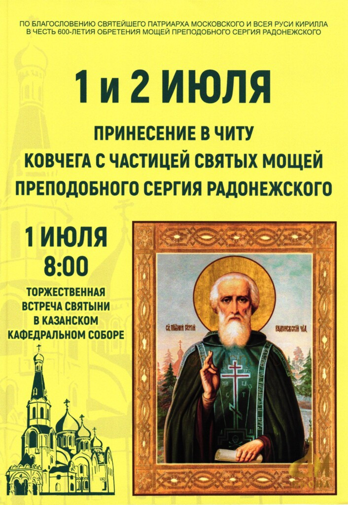 1 и 2 июля 2022 года по благословению Святейшего Патриарха Московского и всея Руси Кирилла в честь 600-летия обретения мощей преподобного Сергия Радонежского в Читу прибудет ковчег с частицей мощей преподобного Сергия Радонежского. 1 июля в 8:00 состоится торжественная встреча ковчега в Казанском кафедральном соборе Читы.