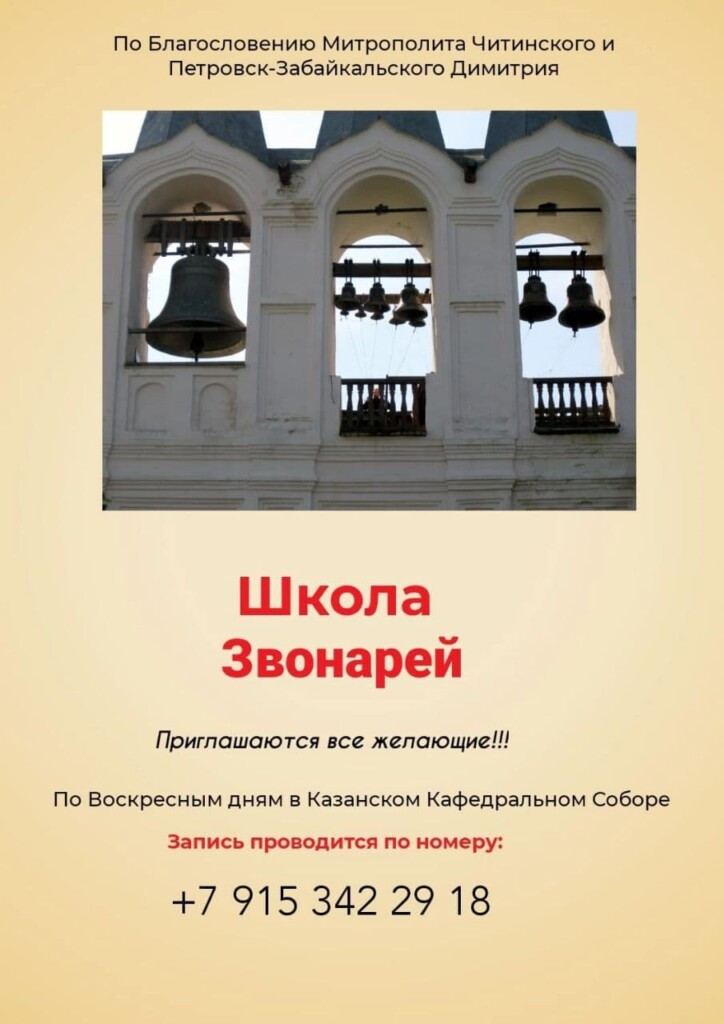 По благословению митрополита Читинского и Петровск-Забайкальского Димитрия, временно управляющий Нерчинской епархией при кафедральном соборе Казанской иконы Божьей Матери в Чите открылась «Школа звонарей». Все, кто хочет научиться звонить в колокола и познакомиться с богослужебным уставом могут позвонить по телефону 8-915-342-29-18. Ответственный за проведение занятий — Иван Сергеевич Петровский. Встреча с руководителем проводится после предварительной беседы. По материалам официального сайта Читинской епархии