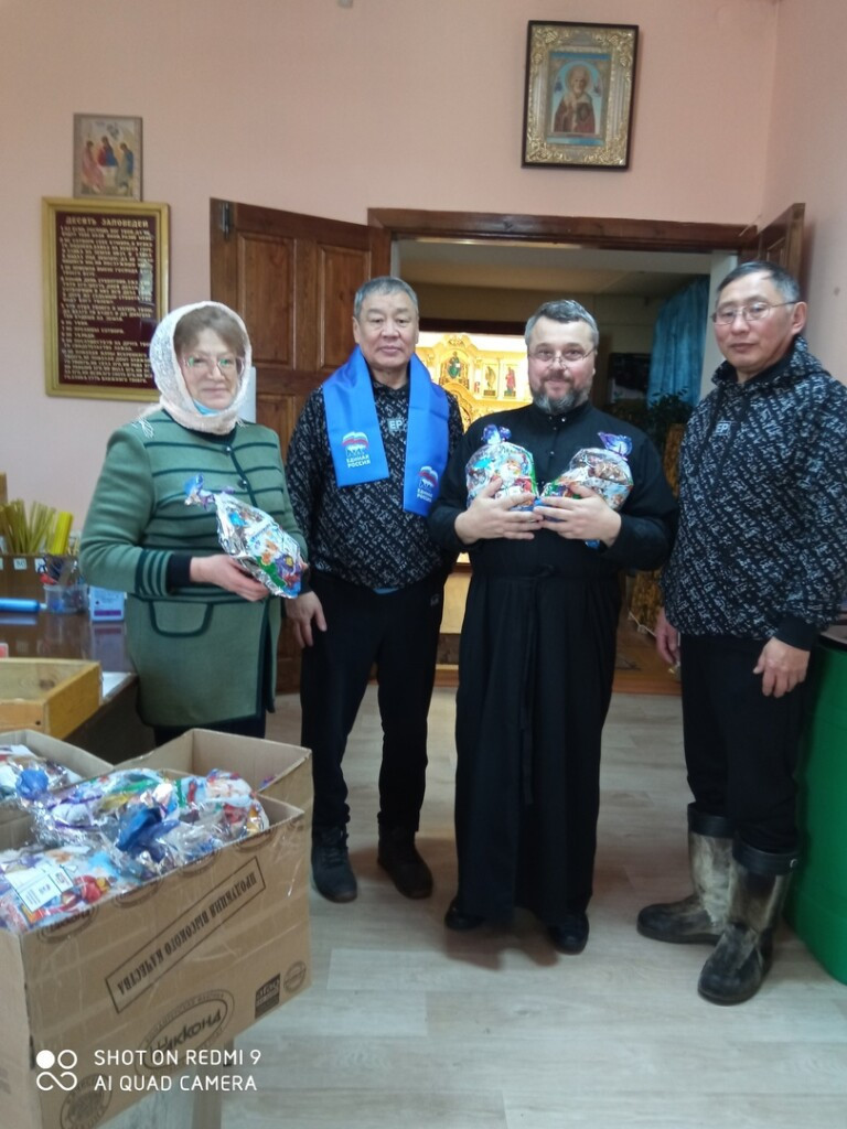 На праздник Рождества Христова в храме святителя Николая Чудотворца в пгт. Агинское дети Воскресной школы получили сладкие Рождественские подарки. Представитель партии «Единая Россия» Дарма Дамдинов доставил подарки в храм. Дети были рады. Подарки от благотворителей храма вручала директор Воскресной школы Шильникова Елена Александровна. ©Нерчинская епархия