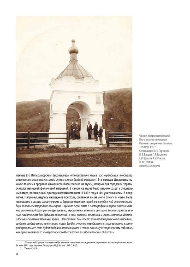 Нерчинский краеведческий музей в рамках издательского проекта «Музей на книжной полке» выпустил книгу «Высочайший гость». В книге повествуется о визите в июне 1891 года, в Забайкальскую область, и, в частности в Нерчинск наследника Российского престола Великого Князя Николая Александровича — будущего императора Николая II. В основу книги вошли дневниковые записи самого Цесаревича, воспоминания сопровождающего его Э.Э.Ухтомского и других современников тех исторических событий. В издание присутствуют фотографии и документы, многие из которых публикуются впервые. По информации Нерчинского краеведческого музея ©Нерчинская епархия