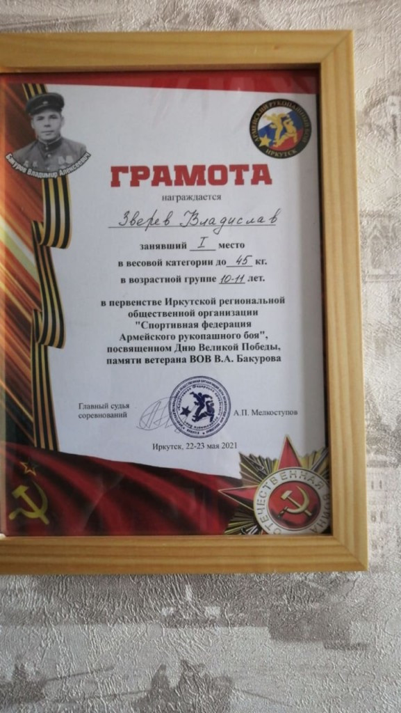 Алтарник храма Вознесения Господня в пгт. Забайкальск Владислав Зверев занял первое место в первенстве Иркутской региональной общественной организации «Спортивная федерация» по Армейскому рукопашному бою. Соревнования проходившие в Иркутске 22-23 мая 2021 года были посвящены Дню Победы и памяти ветерана Великой Отечественной войны Владимира Алексеевича Бакурова. ©Нерчинская епархия