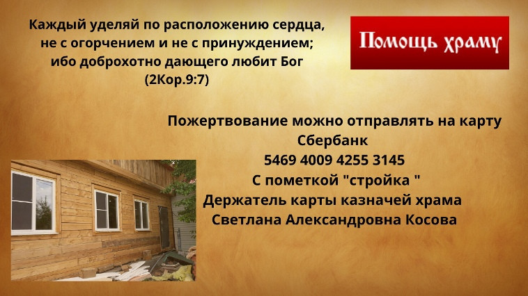В пгт. Забайкальск временно приостановлено строительство просфорной и Воскресного класса на территории храма Вознесения Господня. В настоящее время завершена подготовка стен, пола и потолка к чистовой отделке Воскресного класса. Об этом сообщается в группе храма на странице ВКонтакте. Стройка приостановилась в виду отсутствия денежных средств. Здесь же говорится о том, что всё строительство ведется исключительно на пожертвования прихожан. Помощь можно оказать на карту Сбербанка: 5469 4009 4255 3145. С пометкой «стройка». Получатель — казначей храма Светлана Александровна Косова.