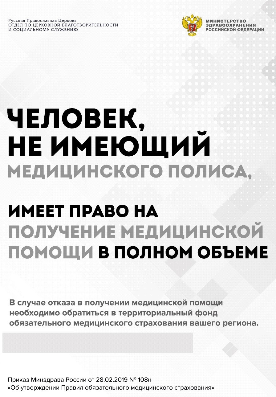 В регионы направлены памятки об оказании медпомощи бездомным, разработанные Церковью и Минздравом России | Русская Православная Церковь, Синодальный отдел по церковной благотворительности и социальному служению В памятках наглядно представлена информация о недопустимости отказа в медицинской помощи бездомным ДИАКОНИЯ.RU