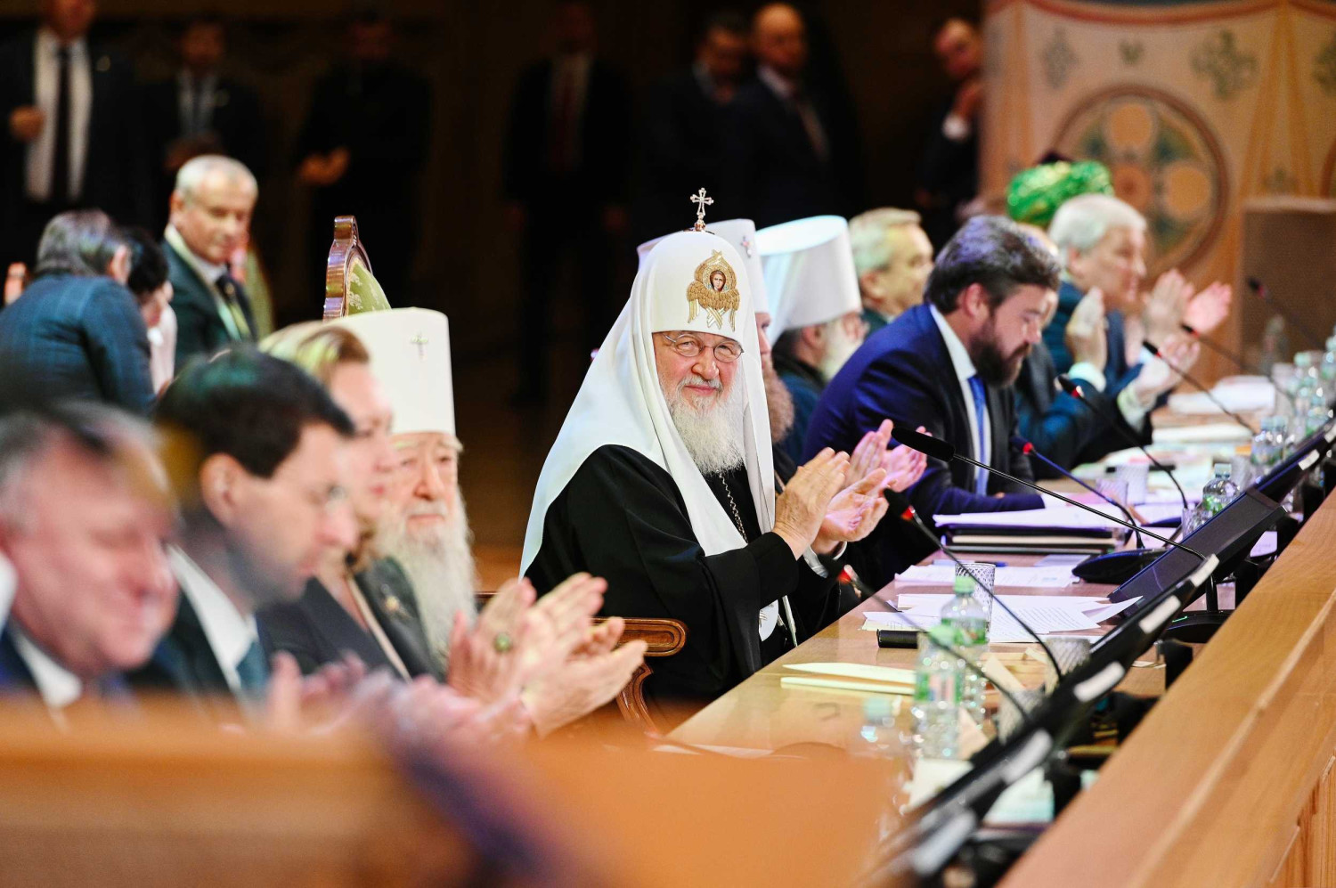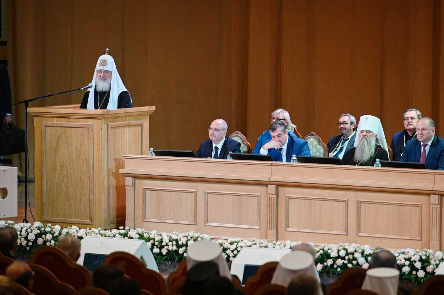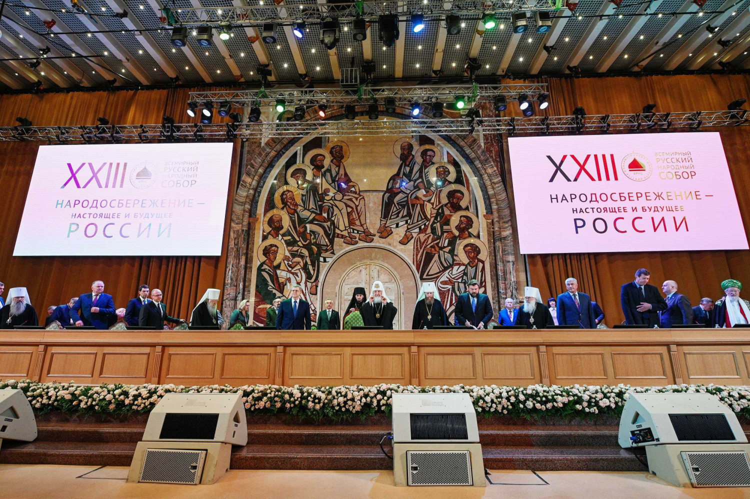 18 октября 2019 года в Зале церковных соборов кафедрального соборного Храма Христа Спасителя в Москве Святейший Патриарх Московский и всея Руси Кирилл возглавил пленарное заседание XXIII Всемирного русского народного собора на тему «Народосбережение — настоящее и будущее России». В президиуме Собора присутствовали: Патриарший наместник Московской епархии митрополит Крутицкий и Коломенский Ювеналий; глава Среднеазиатского митрополичьего округа митрополит Ташкентский и Узбекистанский Викентий; митрополит Санкт-Петербургский и Ладожский Варсонофий; управляющий делами Московской Патриархии, заместитель главы ВРНС митрополит Тверской и Кашинский Савва; заместитель главы ВРНС К.В. Малофеев; генеральный прокурор РФ Ю.Я. Чайка; первый заместитель руководителя Администрации Президента РФ С.В. Кириенко; полномочный представитель Президента РФ в Центральном федеральном округе И.О. Щеголев; полномочный представитель Президента РФ в Уральском федеральном округе Н.Н. Цуканов; министр по делам Северного Кавказа С.В. Чеботарев; министр внутренних дел РФ генерал полиции В.А. Колокольцев; министр юстиции РФ А.В. Коновалов; председатель Комитета Государственной Думы ФС РФ по международным делам Л.Э. Слуцкий; руководитель фракции политической партии «Единая Россия» в Государственной Думе ФС РФ С.И. Неверов; председатель Комитета Государственной Думы ФС РФ по развитию гражданского общества, вопросам общественных и религиозных объединений, председатель Международной ассамблеи Православия С.А. Гаврилов; верховный муфтий, председатель Центрального духовного управления мусульман России Талгат Таджуддин; главный раввин России А.С. Шаевич; председатель Наблюдательного совета Елисаветинско-Сергиевского просветительского общества А.В. Громова; сопредседатель «Союза православных женщин» Н.Б. Жукова и другие. В работе Собора приняли участие иерархи и священнослужители Русской Православной Церкви, представители государственной власти, руководители фракций политических партий Государственной Думы ФС РФ, лидеры общественных объединений, высшее духовенство традиционных религий, деятели науки, образования и культуры, делегаты русских общин из ближнего и дальнего зарубежья, представители общественности. Прямая трансляция заседания шла на телеканалах «Россия-24», «Союз» и «Спас». Заместитель главы ВРНС Митрополит Тверской и Кашинский Савва, обратившись к собравшимся с кратким приветствием, объявил XXIII Всемирный русский народный собор открытым. После исполнения Гимна Российской Федерации был показан фильм, посвященный теме народосбережения. С основным докладом выступил глава Всемирного русского народного собора Святейший Патриарх Московский и всея Руси Кирилл. Далее ведение пленарного заседания осуществлял заместитель главы ВРНС К.В. Малофеев. Первый заместитель руководителя Администрации Президента РФ С.В. Кириенко огласил приветствие Президента России В.В. Путина. Затем С.В. Кириенко в своем выступлении рассказал о мерах по народосбережению, предпринимаемых государством. С приветствием к собравшимся обратился генеральный прокурор РФ Ю.Я. Чайка. Заместитель главы Всемирного русского народного собора К.В. Малофеев сообщил, что приветствия в адрес ВРНС направили председатель Правительства РФ Д.А. Медведев, председатель Совет