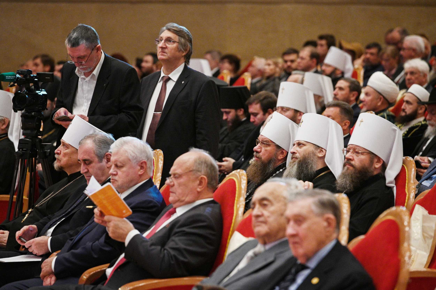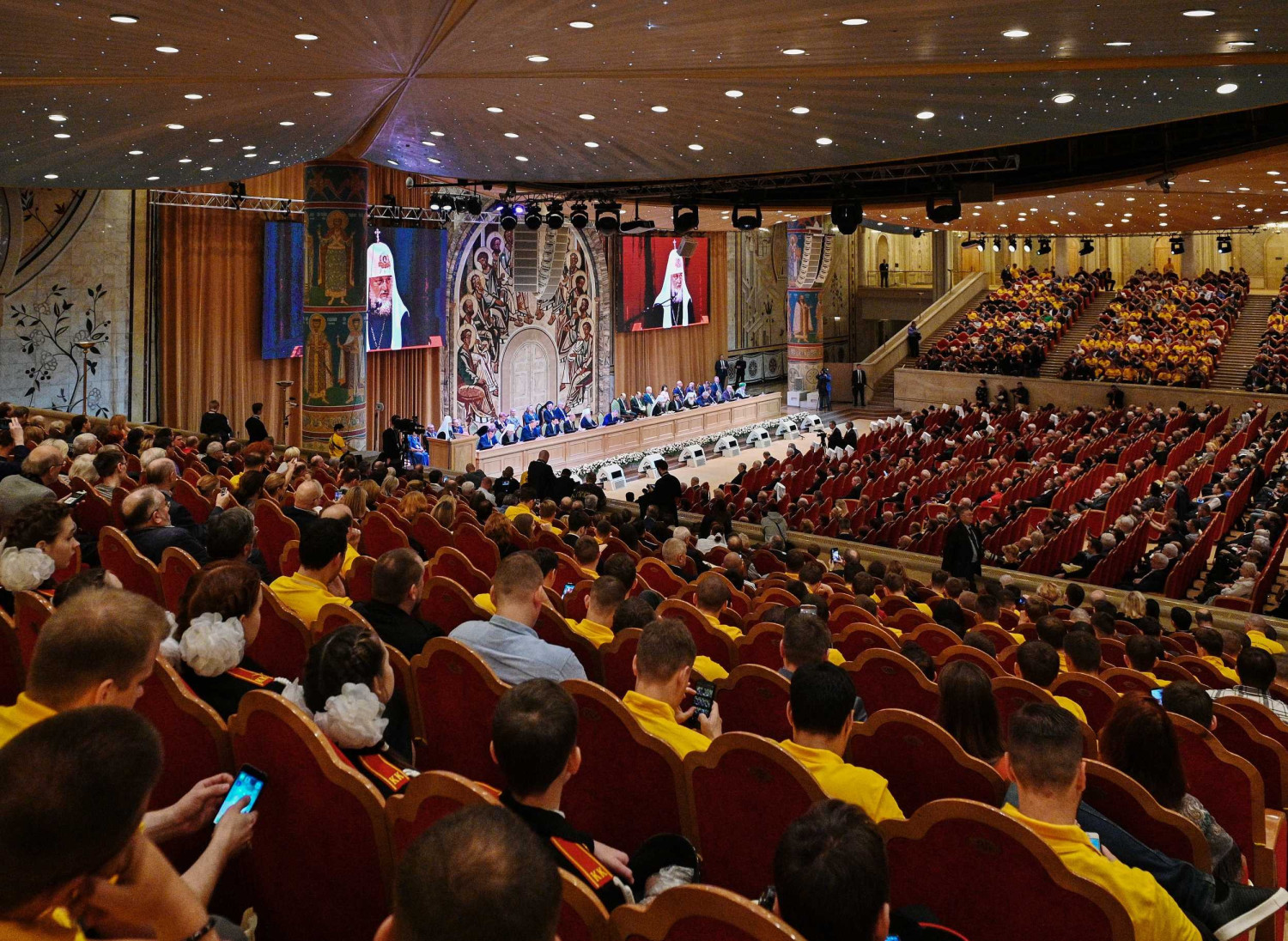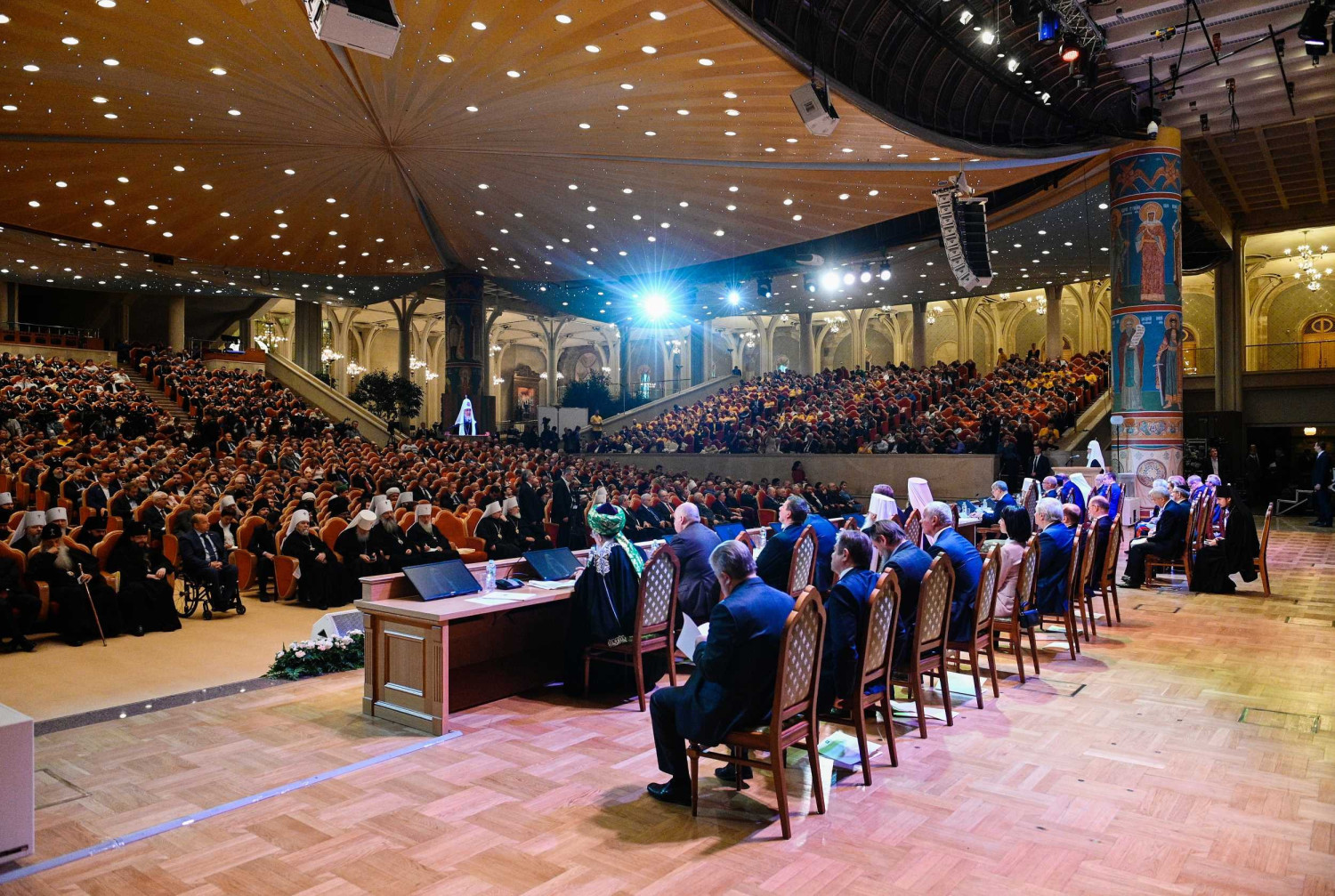 18 октября 2019 года в Зале церковных соборов кафедрального соборного Храма Христа Спасителя в Москве Святейший Патриарх Московский и всея Руси Кирилл возглавил пленарное заседание XXIII Всемирного русского народного собора на тему «Народосбережение — настоящее и будущее России». В президиуме Собора присутствовали: Патриарший наместник Московской епархии митрополит Крутицкий и Коломенский Ювеналий; глава Среднеазиатского митрополичьего округа митрополит Ташкентский и Узбекистанский Викентий; митрополит Санкт-Петербургский и Ладожский Варсонофий; управляющий делами Московской Патриархии, заместитель главы ВРНС митрополит Тверской и Кашинский Савва; заместитель главы ВРНС К.В. Малофеев; генеральный прокурор РФ Ю.Я. Чайка; первый заместитель руководителя Администрации Президента РФ С.В. Кириенко; полномочный представитель Президента РФ в Центральном федеральном округе И.О. Щеголев; полномочный представитель Президента РФ в Уральском федеральном округе Н.Н. Цуканов; министр по делам Северного Кавказа С.В. Чеботарев; министр внутренних дел РФ генерал полиции В.А. Колокольцев; министр юстиции РФ А.В. Коновалов; председатель Комитета Государственной Думы ФС РФ по международным делам Л.Э. Слуцкий; руководитель фракции политической партии «Единая Россия» в Государственной Думе ФС РФ С.И. Неверов; председатель Комитета Государственной Думы ФС РФ по развитию гражданского общества, вопросам общественных и религиозных объединений, председатель Международной ассамблеи Православия С.А. Гаврилов; верховный муфтий, председатель Центрального духовного управления мусульман России Талгат Таджуддин; главный раввин России А.С. Шаевич; председатель Наблюдательного совета Елисаветинско-Сергиевского просветительского общества А.В. Громова; сопредседатель «Союза православных женщин» Н.Б. Жукова и другие. В работе Собора приняли участие иерархи и священнослужители Русской Православной Церкви, представители государственной власти, руководители фракций политических партий Государственной Думы ФС РФ, лидеры общественных объединений, высшее духовенство традиционных религий, деятели науки, образования и культуры, делегаты русских общин из ближнего и дальнего зарубежья, представители общественности. Прямая трансляция заседания шла на телеканалах «Россия-24», «Союз» и «Спас». Заместитель главы ВРНС Митрополит Тверской и Кашинский Савва, обратившись к собравшимся с кратким приветствием, объявил XXIII Всемирный русский народный собор открытым. После исполнения Гимна Российской Федерации был показан фильм, посвященный теме народосбережения. С основным докладом выступил глава Всемирного русского народного собора Святейший Патриарх Московский и всея Руси Кирилл. Далее ведение пленарного заседания осуществлял заместитель главы ВРНС К.В. Малофеев. Первый заместитель руководителя Администрации Президента РФ С.В. Кириенко огласил приветствие Президента России В.В. Путина. Затем С.В. Кириенко в своем выступлении рассказал о мерах по народосбережению, предпринимаемых государством. С приветствием к собравшимся обратился генеральный прокурор РФ Ю.Я. Чайка. Заместитель главы Всемирного русского народного собора К.В. Малофеев сообщил, что приветствия в адрес ВРНС направили председатель Правительства РФ Д.А. Медведев, председатель Совет