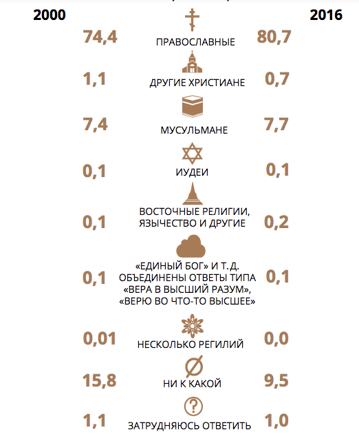 Верующих россиян становится все больше, но роль религии в их жизни остается неоднозначной и непостоянной, выяснила доцент НИУ ВШЭ Яна Рощина. Результаты исследования представлены в новом выпуске «Вестника Российского мониторинга экономического положения и здоровья населения» НИУ ВШЭ. Молодежь не в тренде В 1998 году к верующим или скорее верующим себя относили 63% жителей РФ старше 14 лет. В 2016-м таковых стало 74%. Рост обеспечили представители средних возрастных групп (от 26 до 60 лет). Количество приобщившихся к вере в их среде увеличилось с 62% до 77%. Среди молодежи верующих меньше всего. Взрослевшие в постсоветском обществе с более сильным влиянием религии молодые люди до 25 лет показали самую невысокую динамику: 58% (1998) и 62% (2016). Практически исчезли различия по уровню дохода (в конце 1990-х верующих было меньше среди самых бедных). То же — с образованием: доля верующих с высшим образованием подросла и сравнялась с аналогичным показателем для не имеющих полного среднего. Наиболее религиозны в России женщины, жители сел и Северного Кавказа. Процент верующих среди народов Кавказа не опускался ниже 95 (в 2015 году – 99%). Для сравнения в других этнических группах (2016 г.): татары, башкиры —82%; русские — 73%; украинцы, белорусы, молдаване — 73%; народы Поволжья и Севера — 69%. Отождествлять не значит исповедовать Почти 81% взрослых россиян — православные. На втором месте мусульмане — 7,7%. Не относят себя ни к какой религии 9,5% (в 2000 году — 16%). Распределение ответов на вопрос: «К какой религии Вы себя относите?», 2000, 2016 гг., % Источник: расчеты автора исследования по данным RLMS-HSE Достаточно много тех, кто указывает свою религию, но при этом не считает себя верующими (свыше 14% православных и 5% мусульман). Однако православные приходят к вере активнее других: с 60% (2000) до 73% (2016). Религиозность в зависимости от типа религии, 2000–2016 гг., в среднем, % Источник: расчеты автора исследования по данным RLMS-HSE Редкое посещение служб Несколько раз в месяц в церковь ходят лишь 6% населения (среди верующих — 8%). Большинство делает это не чаще одного раза в месяц (35% среди всех, 48% среди верующих), или не делает вовсе (32%, а среди верующих — 43%). По частоте появления на религиозных мероприятиях лидируют женщины и представители старшего поколения (60+). Из конфессий — неправославные христиане: 48% из них бывают в храмах несколько раз в месяц. Среди православных таких 7%, мусульман — 5%. Частота посещения религиозных мероприятий в зависимости от вероисповедания, % среди верующих Источник: расчеты автора исследования по данным RLMS-HSE Непохожие Отношение к религии связано с семейным статусом и образом жизни. Верующие реже не состоят в браке или состоят в незарегистрированном. В их числе больше разведенных, вдовцов/вдов, многодетных семей и меньше семей без детей. Ниже доля потребляющих алкоголь и курящих, особенно среди мусульман. А сама вероятность курения, вне зависимости от вероисповедания, убывает с ростом посещаемости церкви. Уровень занятости неверующих и верующих примерно одинаков: 59% и 57%. Разница в трудовых доходах тоже невелика, но не в пользу последних: в среднем 20,6 тыс. руб. против 21,1 тыс. руб. в ценах 2016 года. Самая высокая зарплата у неправославных христиан — 24,7 тыс. руб., самая низкая у мусульман — 17,9 тысяч. Что дает религия Большинству — силу справляться с трудностями (68% опрошенных верующих